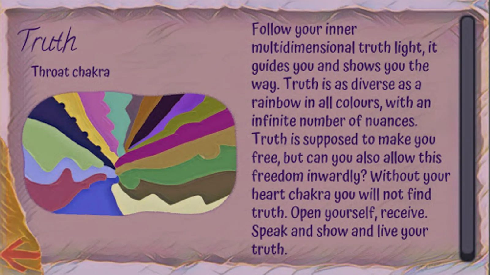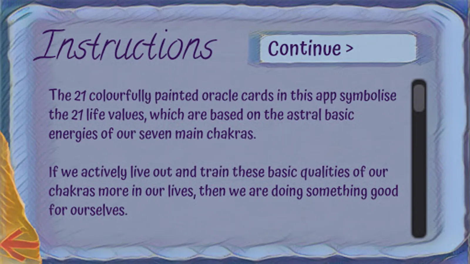 The 21 colourfully painted oracle cards in this app symbolise the 21 life values, which are based on the astral basic energies of our seven main chakras.