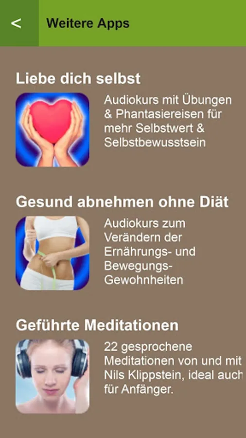 The four imaginary journeys in this app ( "Better sleep 1-4") help you, body and mind to relax effectively and to calm down.