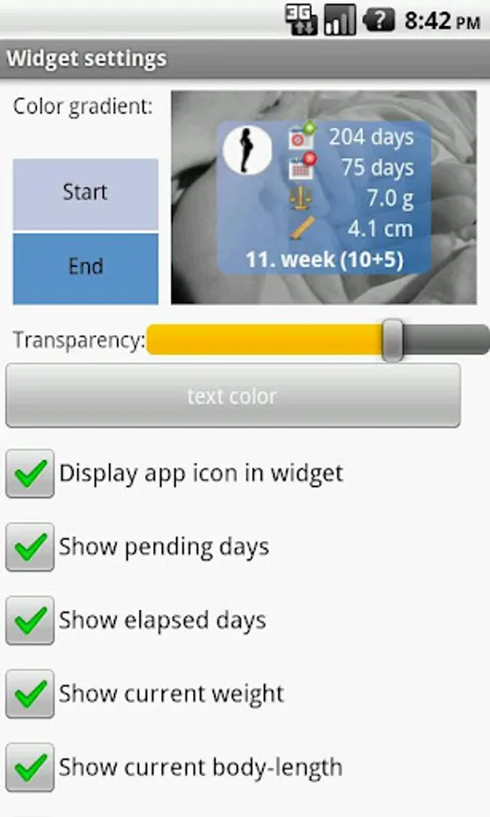 To activate the widget, touch your screen for a few seconds and then select the entry "widgets" and then the app "Pregnancy watcher".