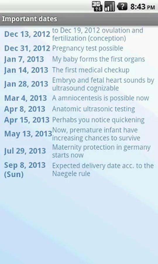 This app shows to you after entering some basic data your current week of pregnancy, how many days you're already pregnant, the current approximate size and weight of your baby and a few other important bits of information such as the date of the first prenatal visit, when your maternity leave will start (based on the German regulation), or the date on which it you can possibly feel the first child quickenings etc..
