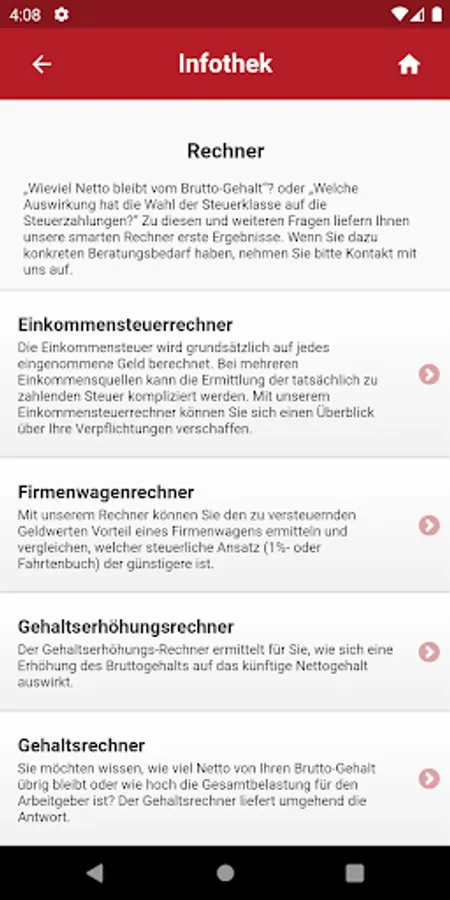 The app also provides information on selected tax law issues: What should be considered when keeping a logbook? What options are there for tax-privileged salary payments to employees? The app provides you with the answers to these and other topics.
