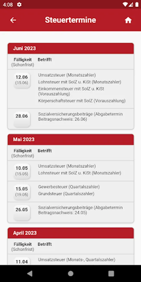 Would you like to know when and which tax payment dates are due? Whether e.g. income or sales tax prepayment, wage tax or trade tax - you will find the relevant dates in the app.