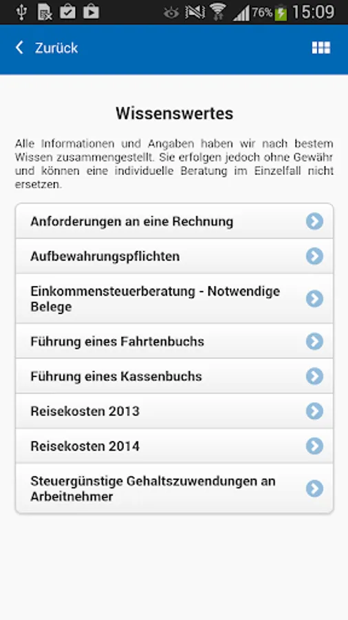 Also on selected tax issues keeps the app information: What to consider when implementing a logbook? What possibilities of tax-favored salary employee benefits are there? For these and other topics gives you the app for instant look up the answers.