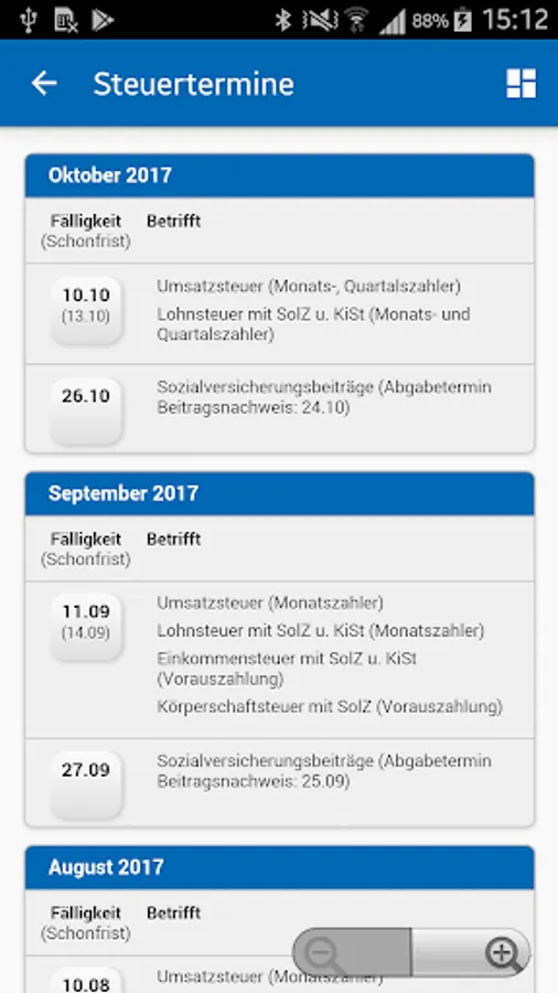 You wish to know which tax payment dates pending? Whether as Income tax or sales tax prepayment income tax or trade tax - in the app you can find the appropriate dates.