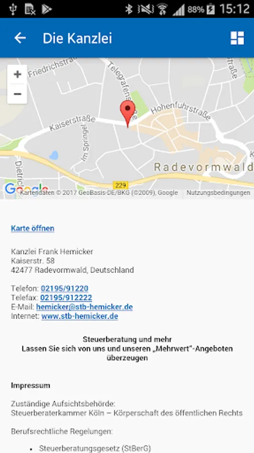 Of course you have with this app also always have a direct line to the office. All contact details incl. Convenient Directions are available therein. If you telephone number or e-mail address does not have time on hand, you simply refer to the app.