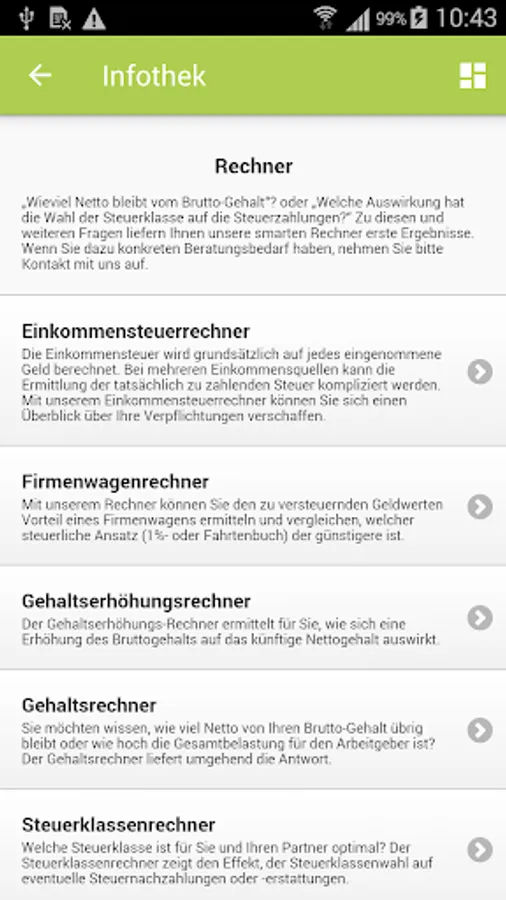The app also has information on selected tax issues: What should be considered when maintaining a logbook? What are the possibilities of tax-privileged salary payments to employees? The app provides the answers to these and other topics.
