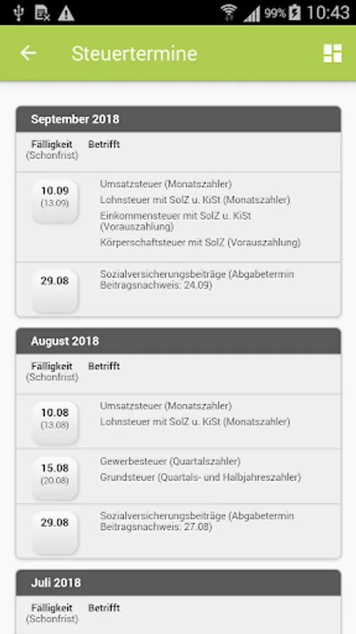 Would you like to know when which tax payment dates are due? Whether, for example Income or sales tax pre-payment, payroll tax or trade tax - in the app you will find the appropriate dates.