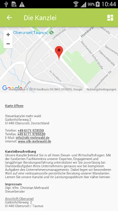 Of course you always have a direct connection to the law firm with this app. All contact details including comfortable directions are available. If you do not have your phone number or e-mail address at hand, simply look it up in the app.
