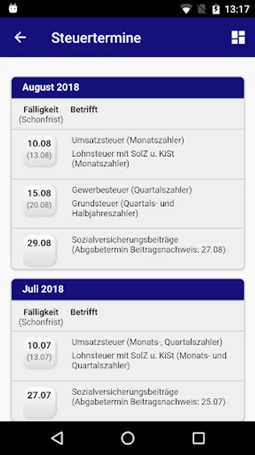 You wish to know which tax payment dates pending? Whether as Income or tax prepayment, income tax or business tax - in the app you can find the corresponding dates.
