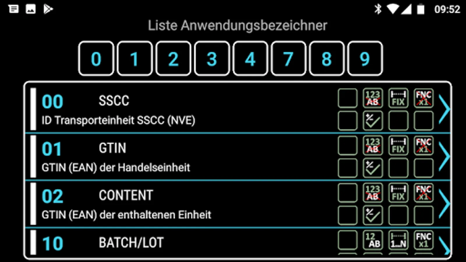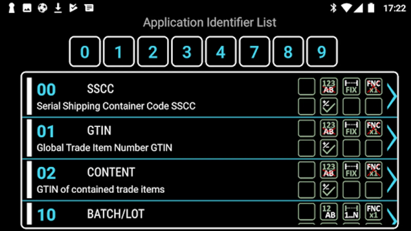 With currently 156 identifiers (as of 01-2019), all important data on the product can be decoded e.g. Product identifiers, lot number, dates, weights, etc.