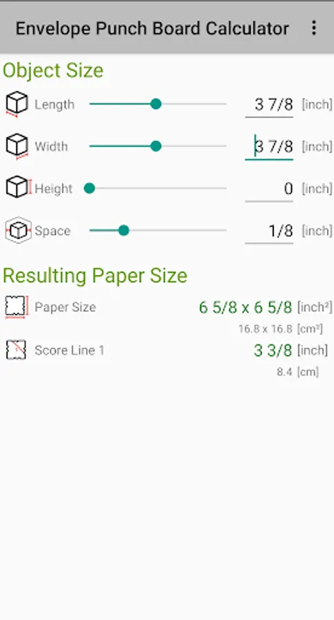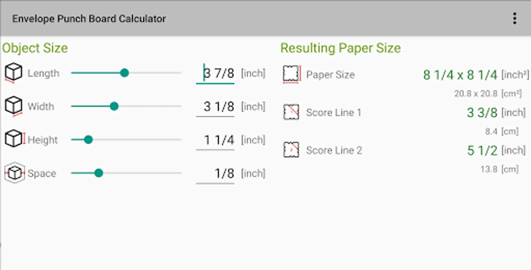 With this app, the dimensions for paper and score lines for the Envelope Punch Board of Stampin Up / We R Memory Keepers can be easily determined.