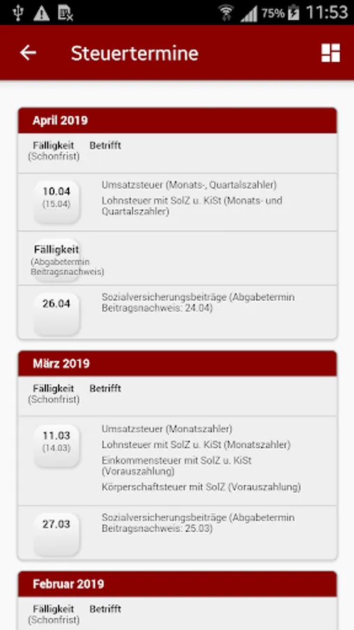 You want to know, when that tax payment dates? Whether, for example, Income tax or sales tax deduction, income tax or business tax - in the app you can find the corresponding dates.