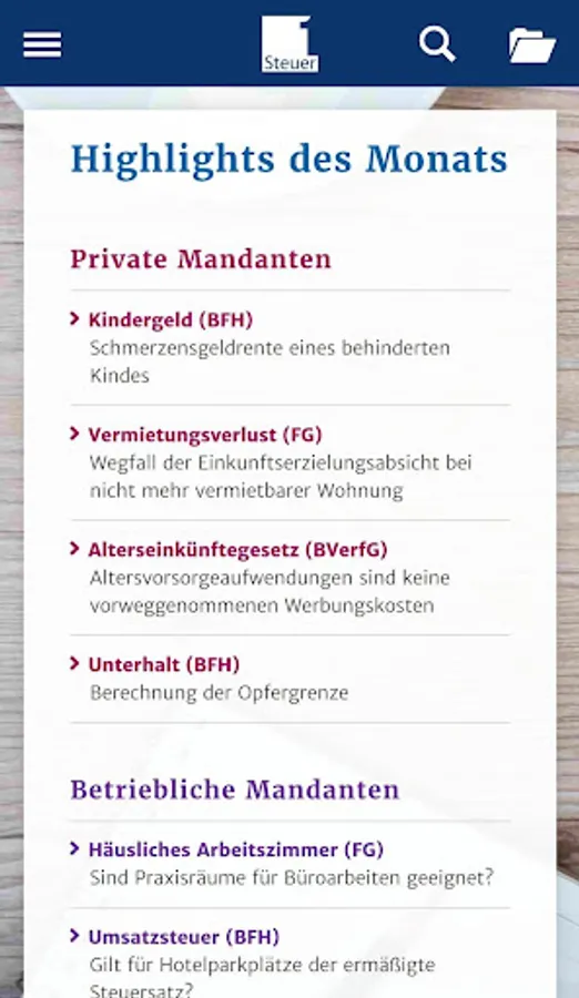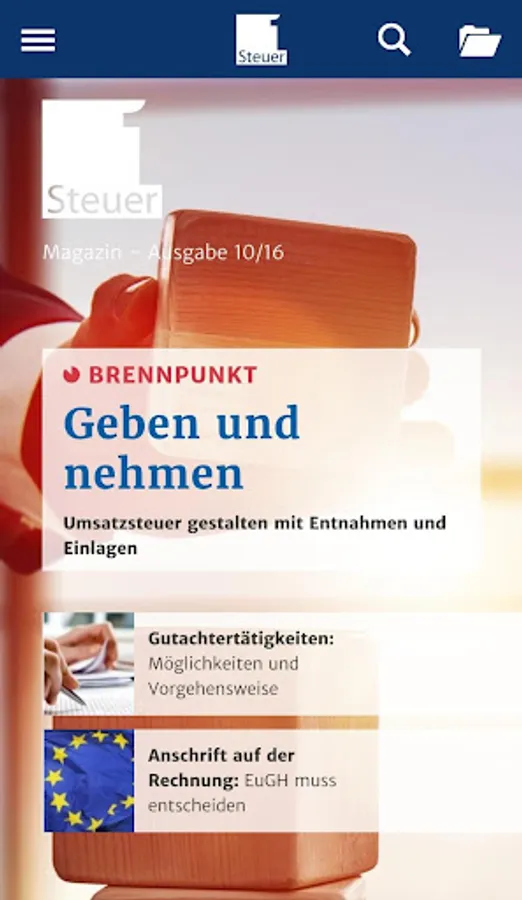 The control 1 magazine gives users the control Haufe Office a monthly update to the most important tax developments on the internal Punk topics from the tax. It contains news from law, financial management and legislation, a reform calendar, a reform lexicon as well as tips for your law firm management.