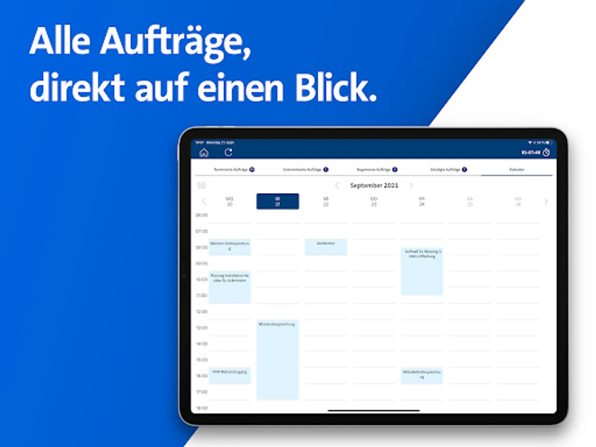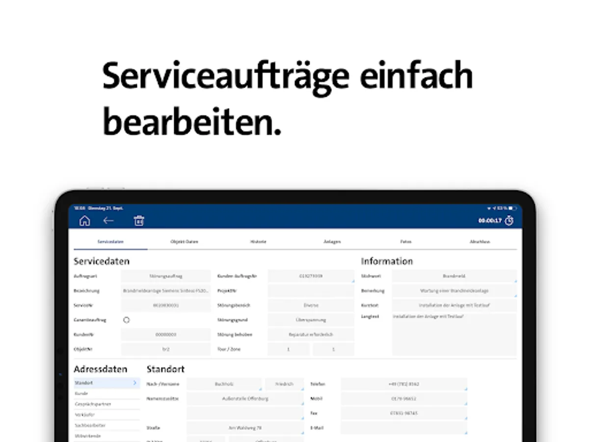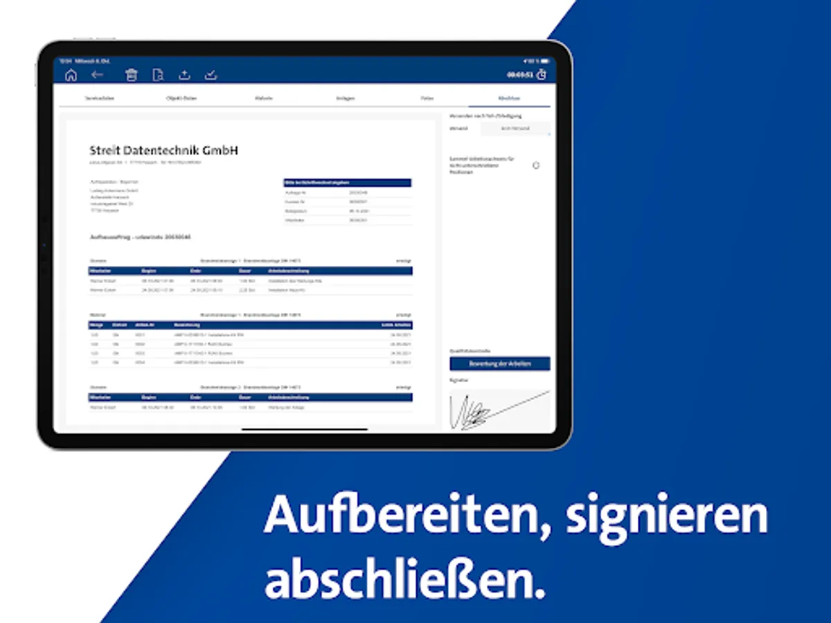 Craftsmen working in the field are able to manage and process their orders while on the move. Particularly practical: the app can be used both online and offline. A lack of mobile phone reception in the utility room is therefore not a problem. Users manage orders, projects or maintenance work on site with the tablet, have access to relevant customer and item data, hours, maintenance data or construction site photos. In online mode, all data is transmitted and updated in real time. At the end of the job, the fitter obtains the customer's signature digitally directly with the tablet.