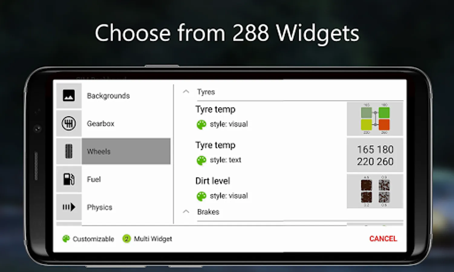 • Choose from a large number of widgets like analog displays, [3] gear indicator, ⛽️ fuel usage, lap times, 🚥 RPM LED Bars and many more.
