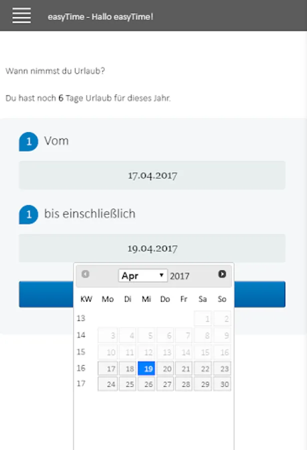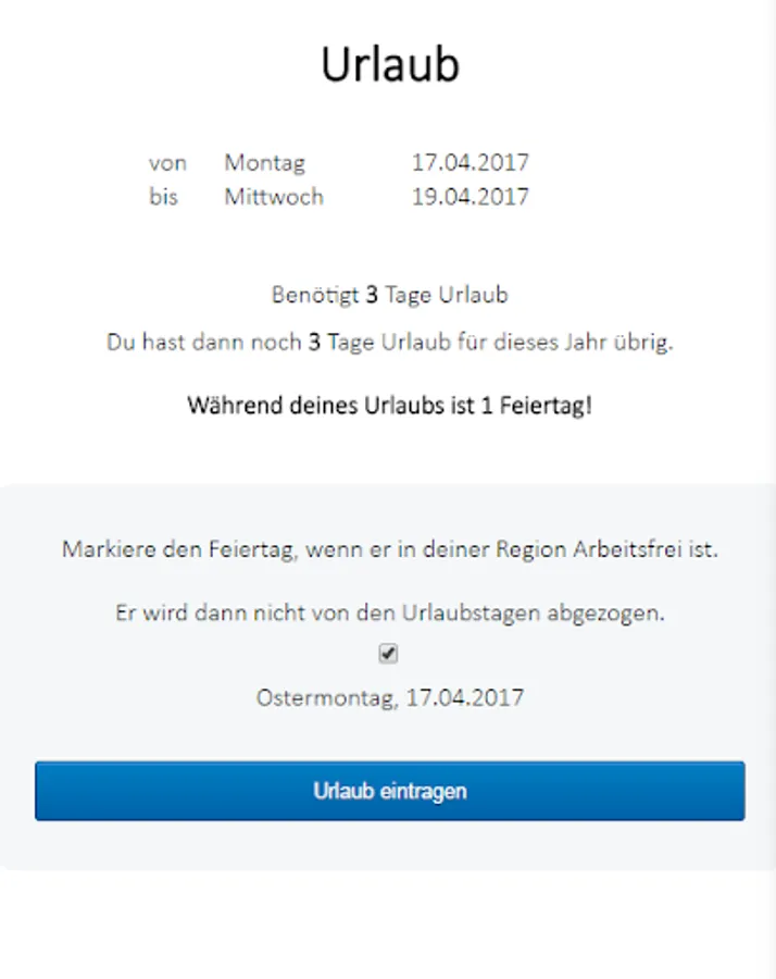 Full-size + UrlaubsManager independently of working days. With self-defined working days and automatic recognition of holidays and acquisition of remaining vacation to the new year