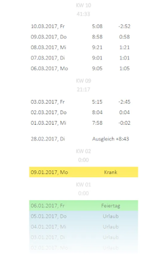 + No complicated calculations with hours per week, only one registered day will be considered! where not worked on days must not be entered!