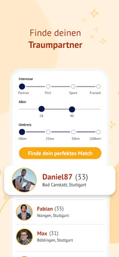 This is very important to us. That's why we have many features in our dating app to keep you safe. Because you should be able to concentrate on the person who really interests you when looking for a partner. With whom you want to meet because you feel that it fits. Who you want to have a wonderful time with. And that will make you happy in the future. This is what a dating app should feel like.