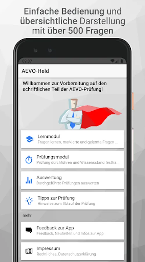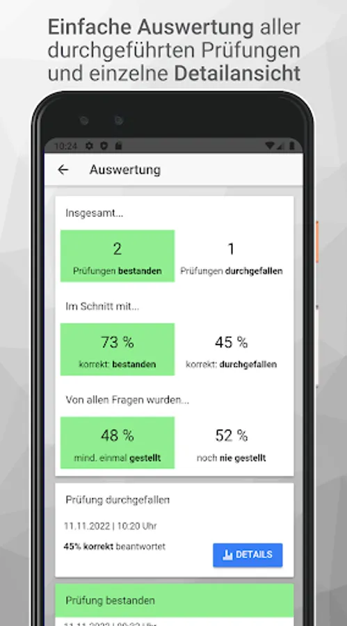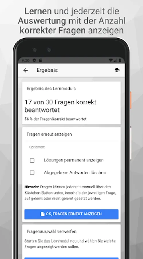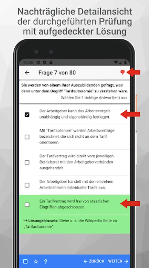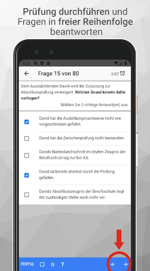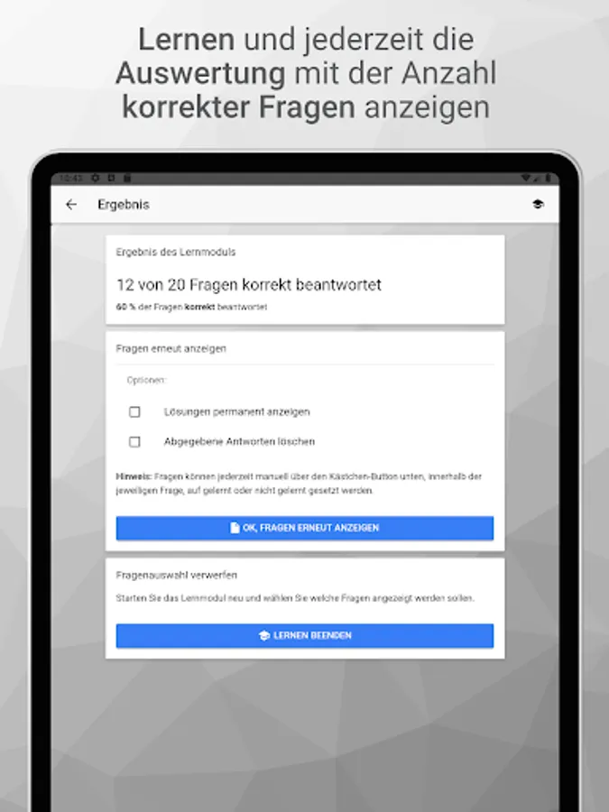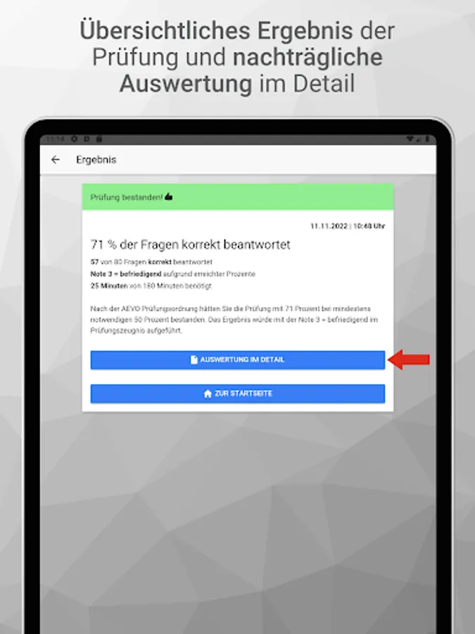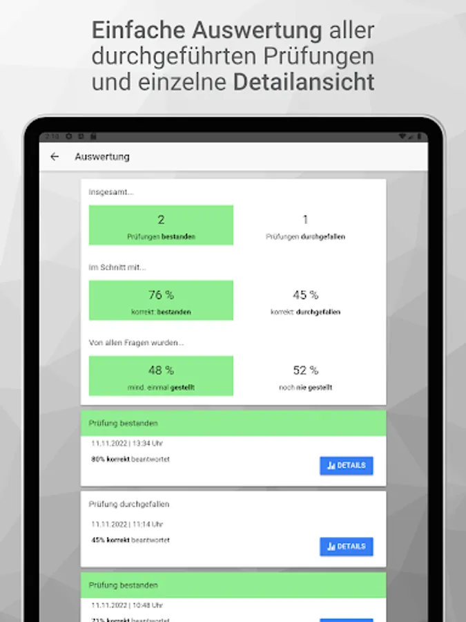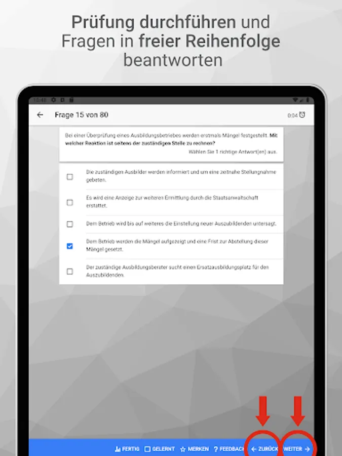 When creating the app, particular importance was attached to simple and intuitive operation based on Google Design recommendations. As with the real exam, you can jump freely between the questions and answer them in any order and correct them later if necessary.