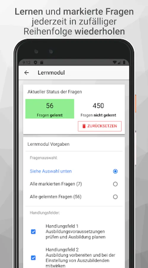 The app, created by the certified trainer for future trainers, contains more than 500 selected questions from all four fields of action, which are similar to those in the original trainer aptitude test of the responsible bodies (IHK and partly HWK). In the course of the compact presentation for mobile devices, however, in contrast to the original exams, extensive text introductions were dispensed with. The tasks are multiple-choice and, like the real exam, have one or more correct answers. The order of the questions and associated answers changes with each run.