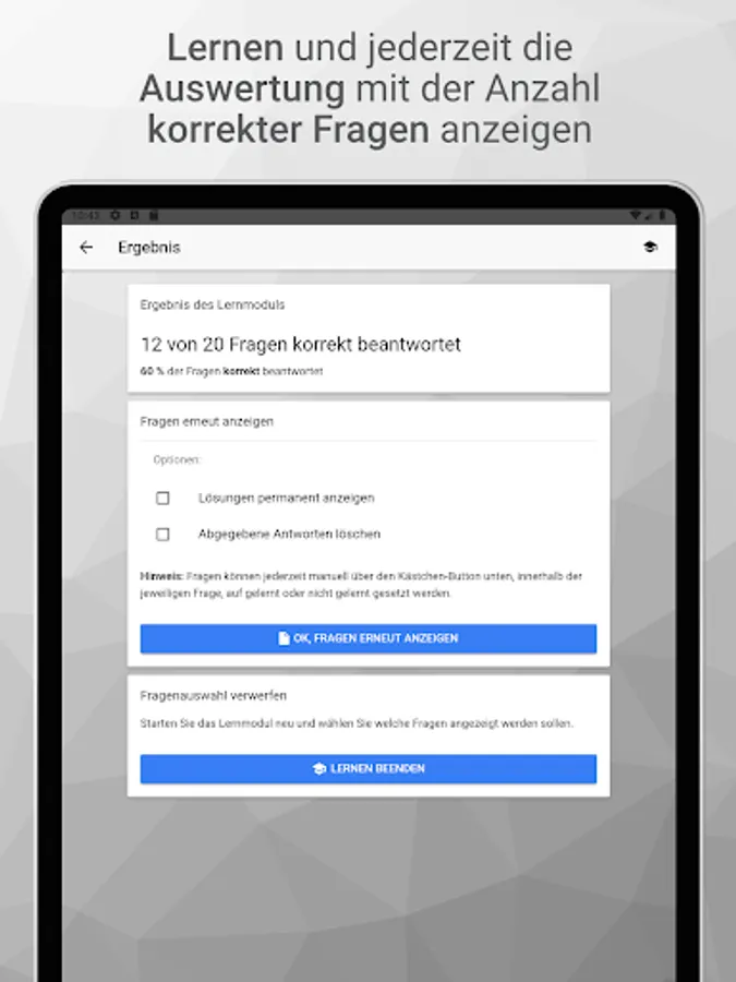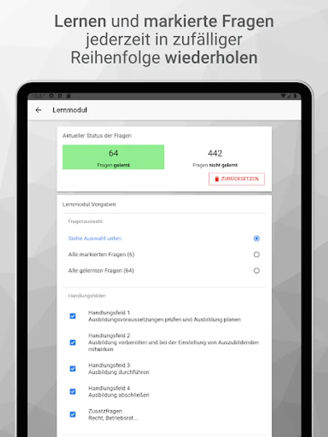 A learning module offers the opportunity to train using a number of randomly selected questions from the various fields of action or to go through all the questions last marked again.