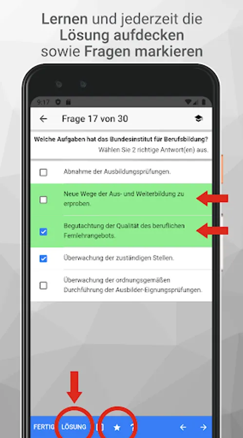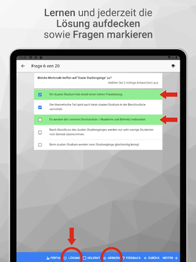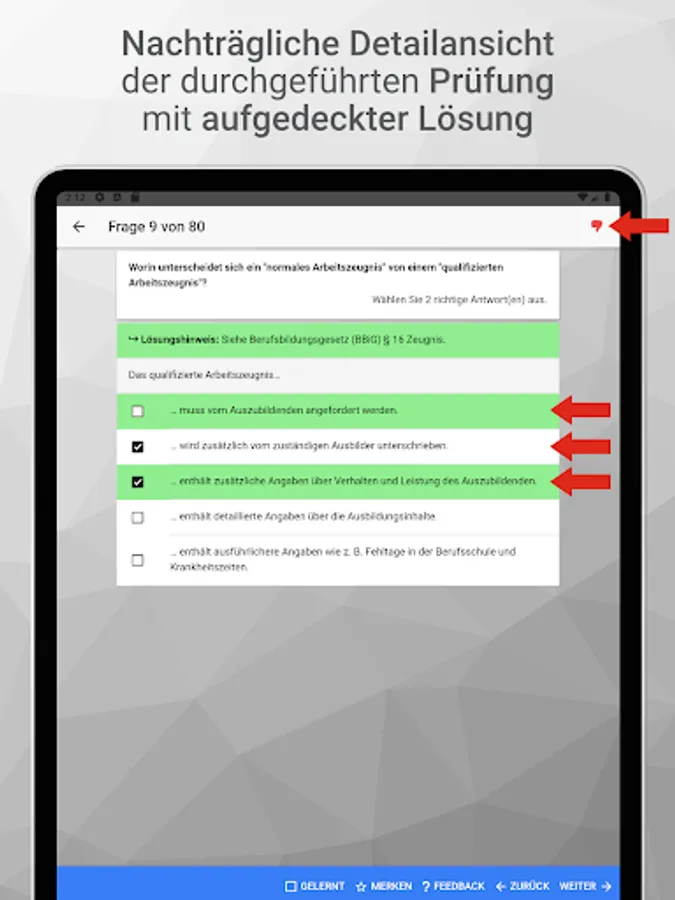 In the learning module, you can display the correct solutions at any time. At the same time, additional questions can be put on the watch list at any time and called up again later.