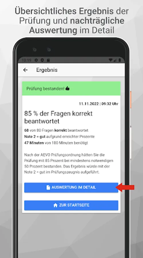 The evaluation module gives you detailed feedback on the tests you have carried out so far. Tests that have already been completed can be called up again, making it easy to identify deficits. Based on the clear evaluation, it is easy for you to decide whether you have already prepared sufficiently for the written examination according to the AEVO.