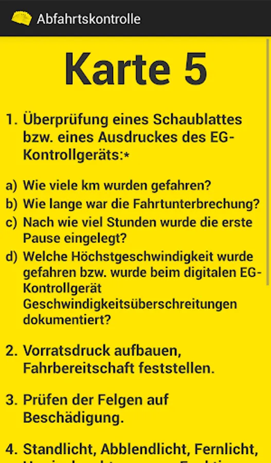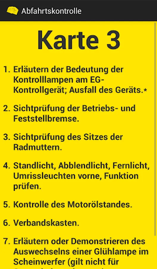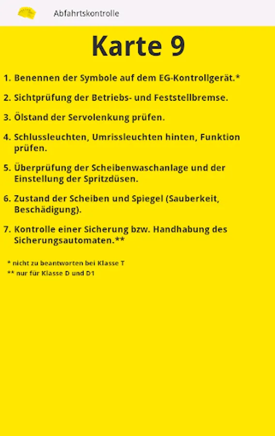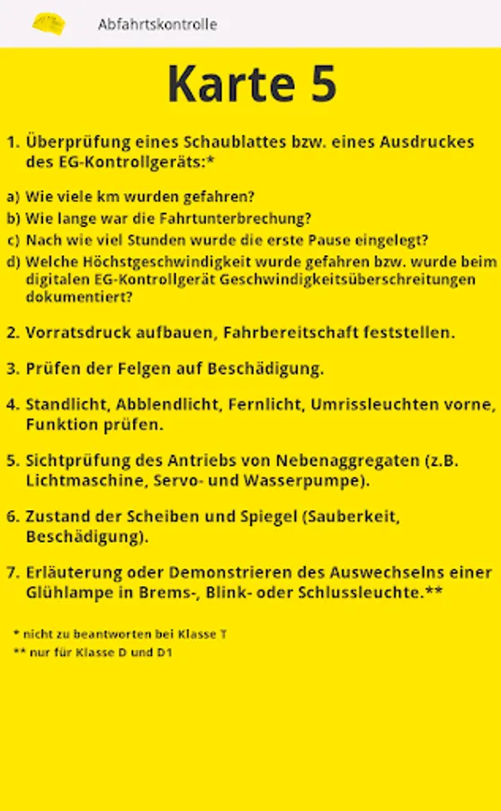 This must be completed by the examinee when acquiring the above-mentioned driving license classes. I.e. one of the 10 cards is chosen and this must then be answered correctly. If a point is answered incorrectly, the examinee may answer the same point from another card.