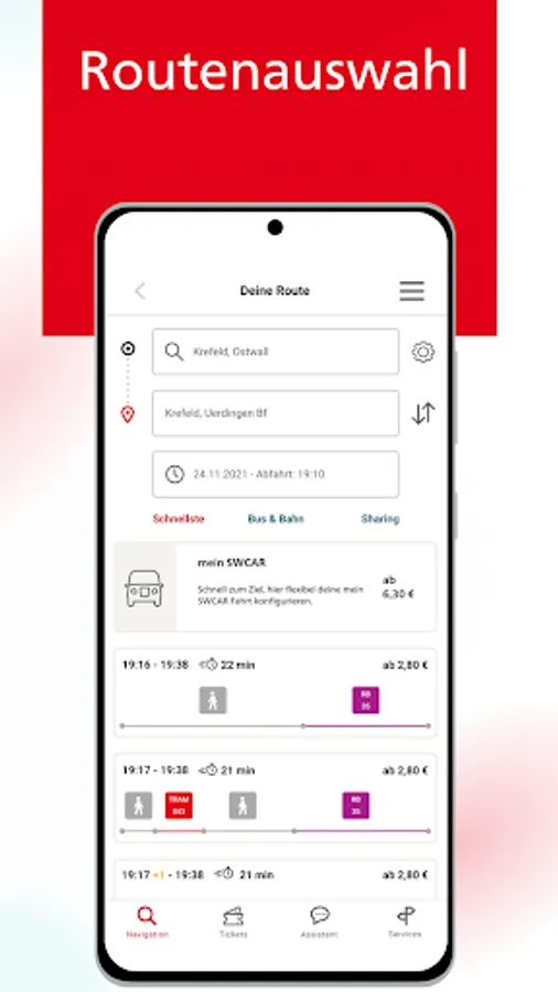 You’ve got the complete product range of our SWK mobility products in our SWK app. Book your bus and train tickets, take a trip with the „mein SWCAR” and much more.