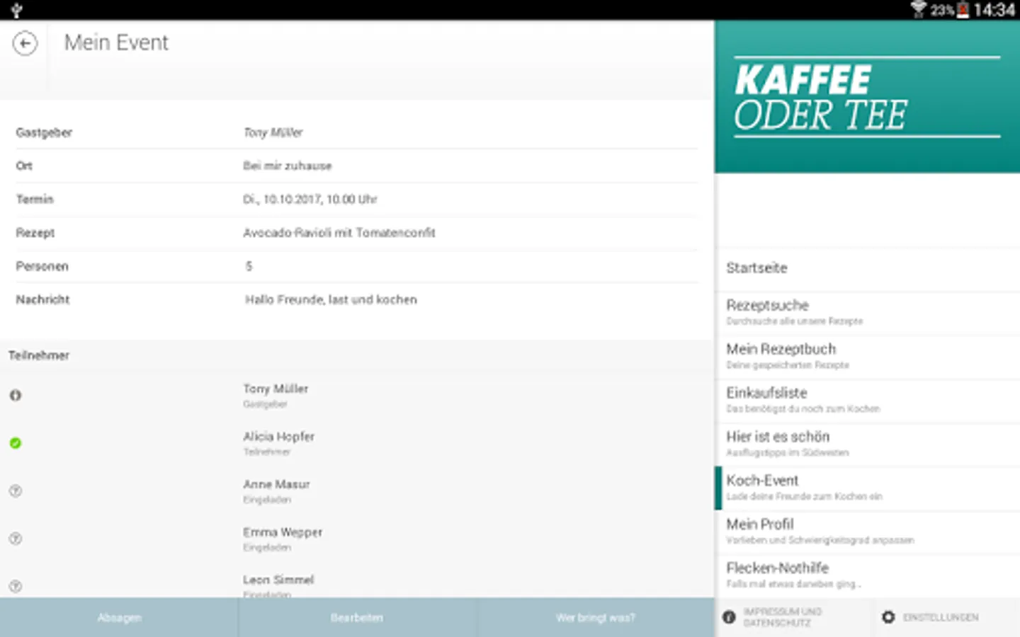 Seek you a recipe from Vincent Klink, Simon Tress, Mira Maurer, Tarik Rose, Otto Koch, Karlheinz Hauser, Jacqueline Amirfallah, Rainer Klutsch, Nicole Just, Ali Güngörmüs, Michael Kempf, Martina Kömpel, Theresa Baumgärtner, Sören Anders, Frank Buchholz UVA and invite friends through the app for cooking one.