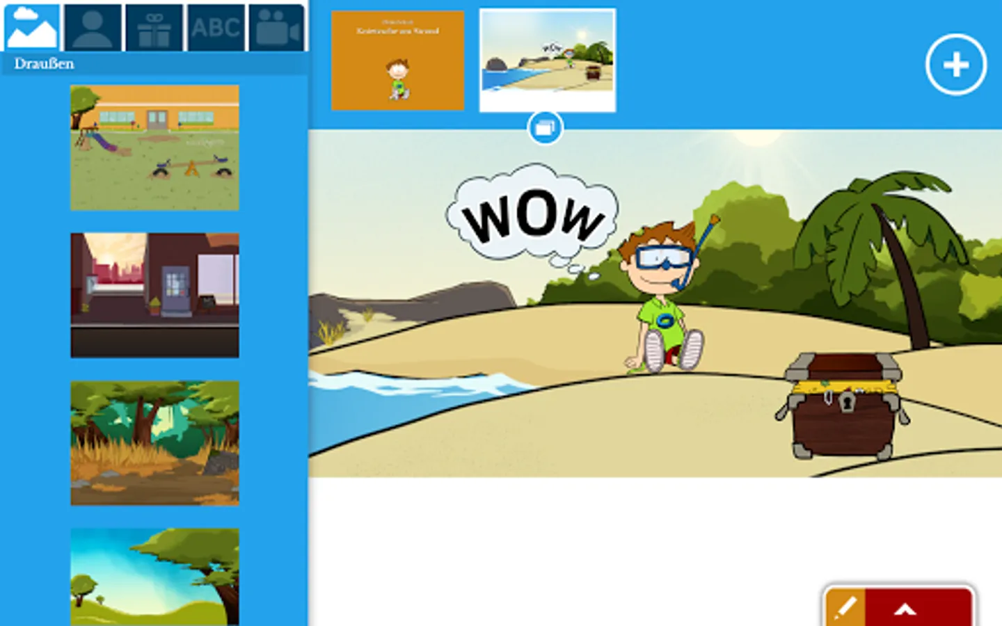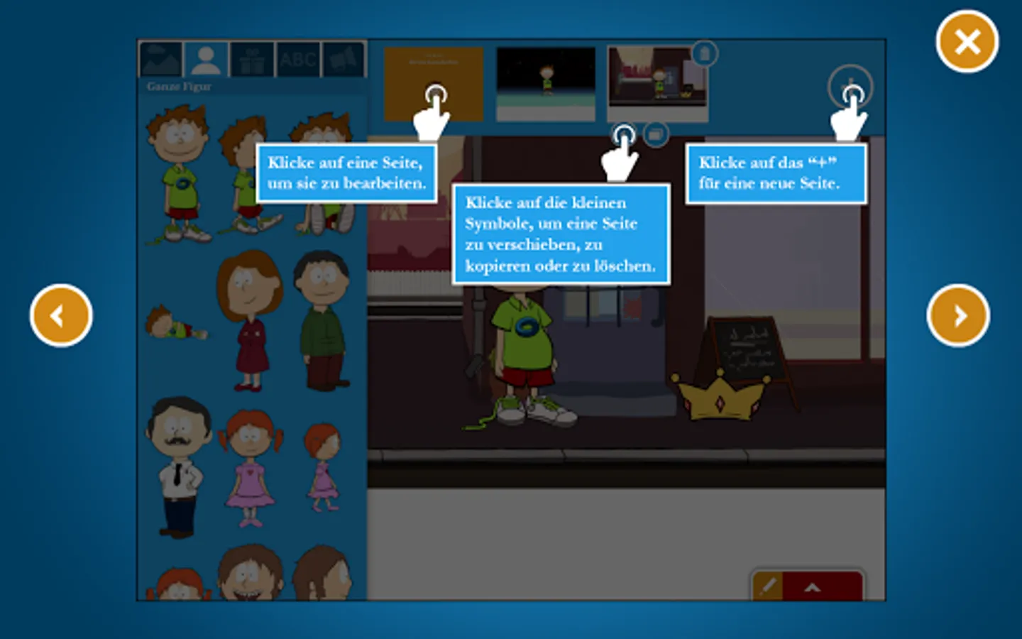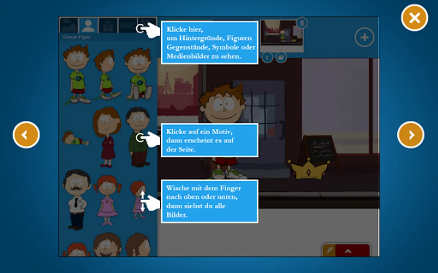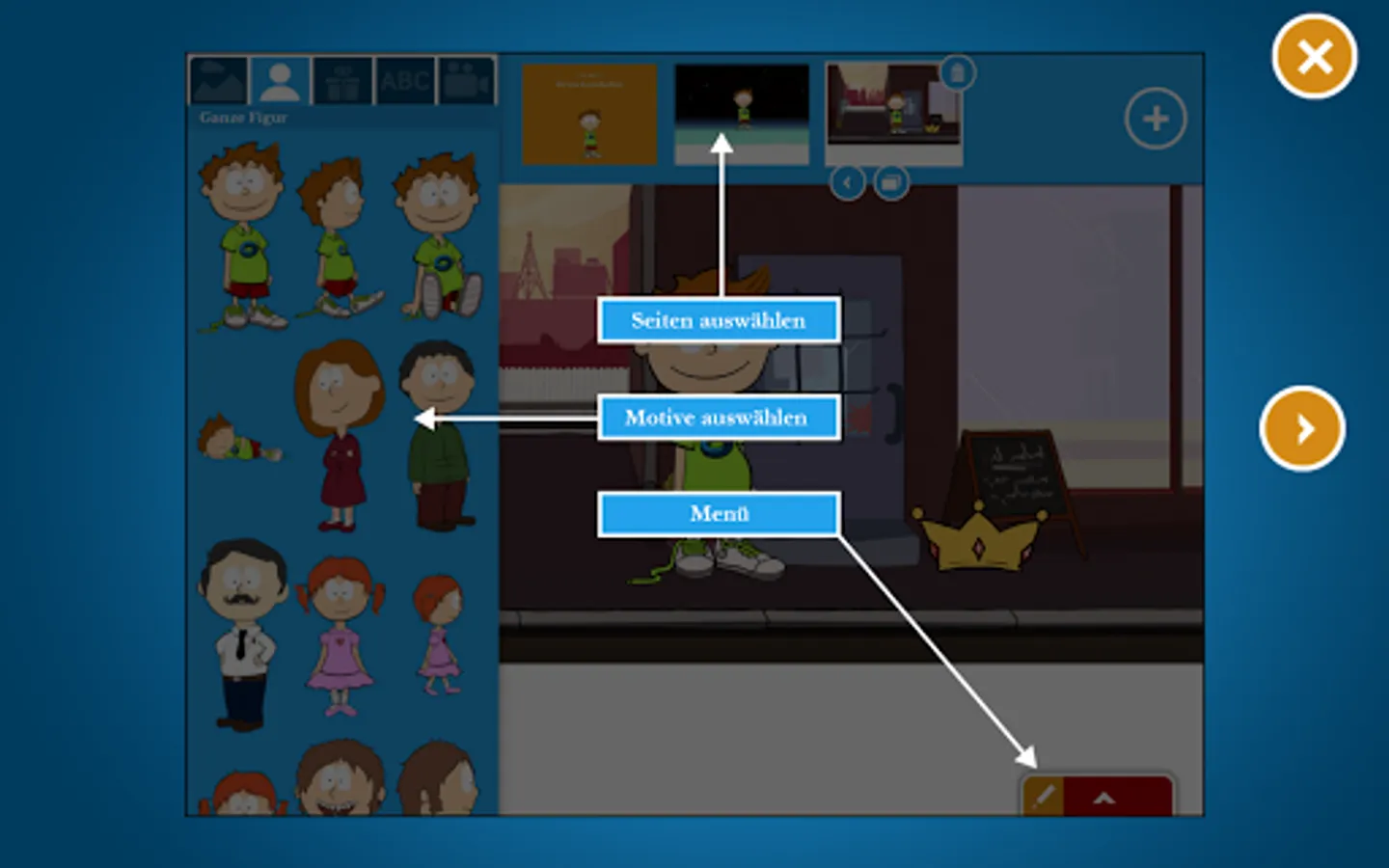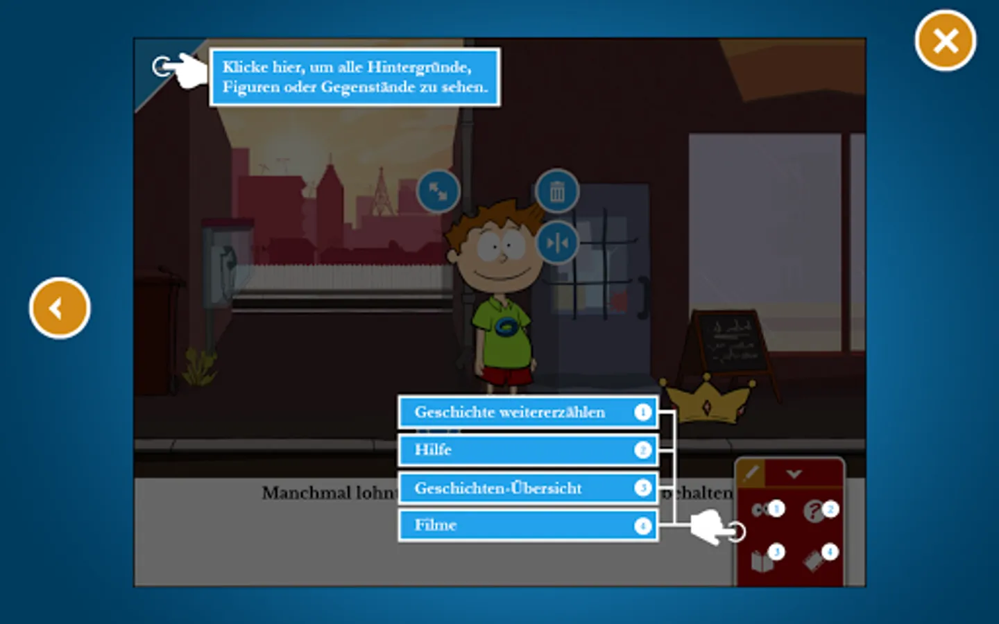 All Knietzsche figures, various backgrounds and many objects from the films are available for free design. You can use them to create your own stories with many possible combinations. Everything is possible: free storytelling or thematic work, for example on the subject of news. Self-written texts can complement the pictures. A PDF export is possible for distribution and printing.
