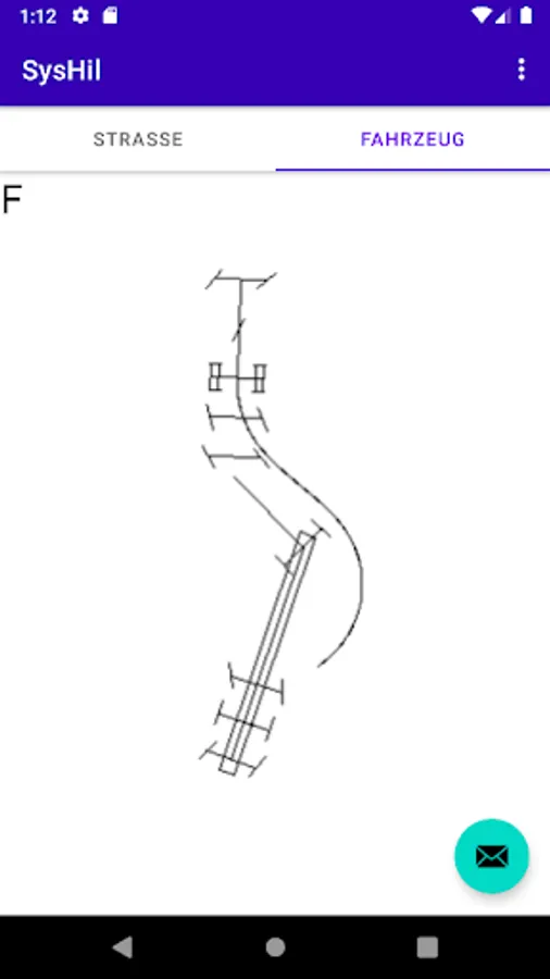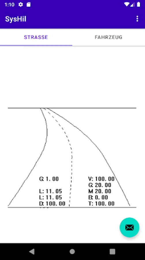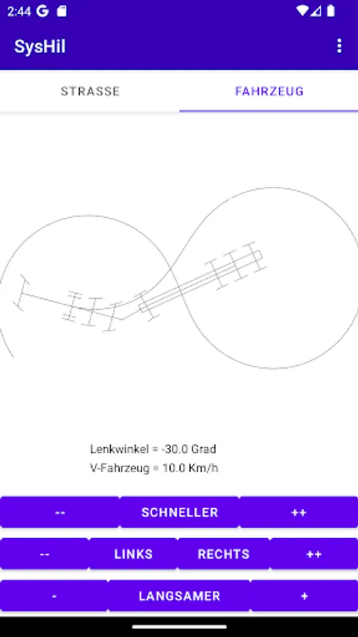 The app calculates vehicle conditions and displays them graphically. With the help of the control, the steering angle and vehicle speed can be changed. The vehicle is displayed as a wire model and you can visually evaluate the movement variables of a truck with a drawbar trailer. The vehicle states are calculated in a 10 [ms] task with transfer functions for front axle, rear axle and drawbar trailer with position, angle and speed and second-order IIR filters.