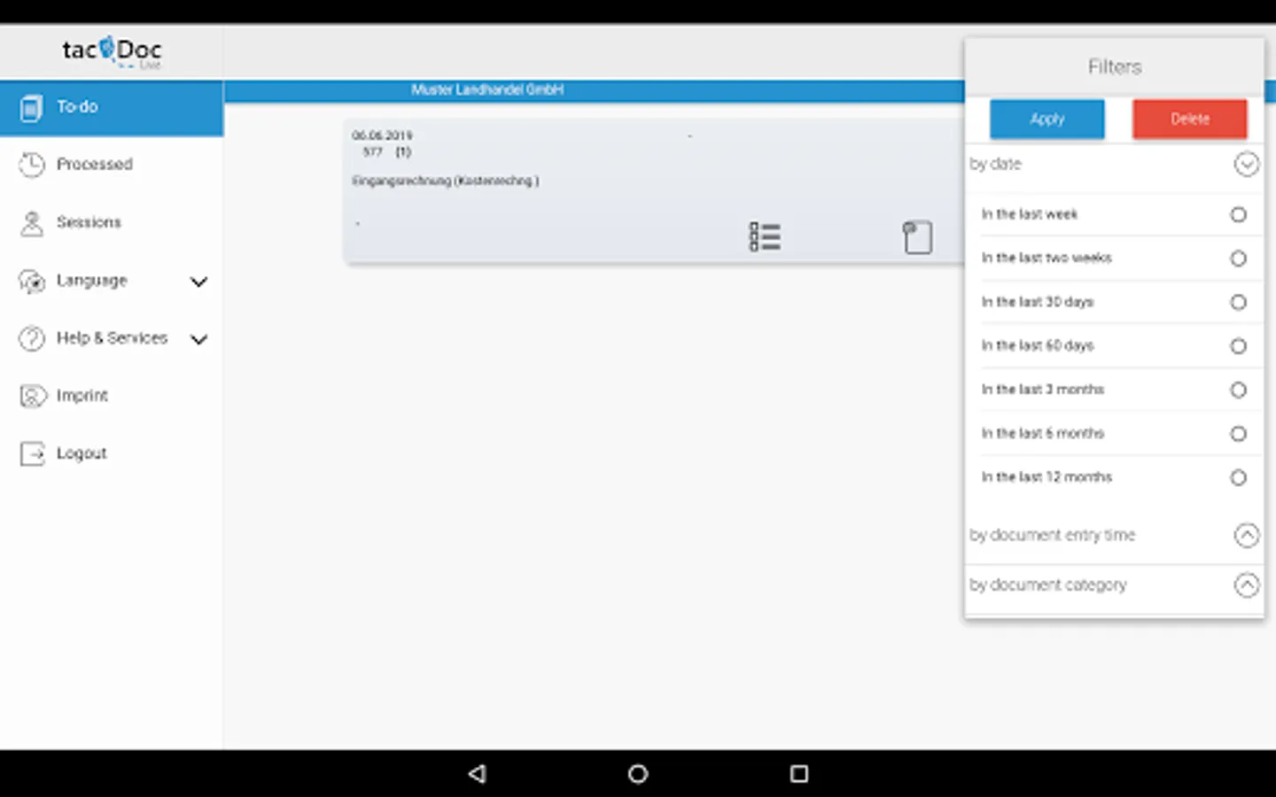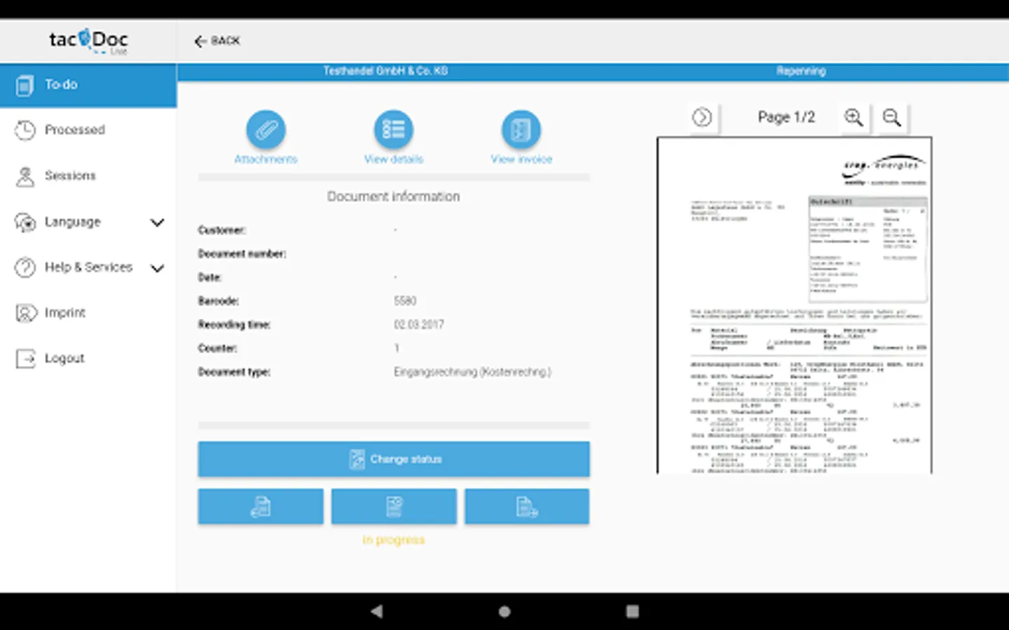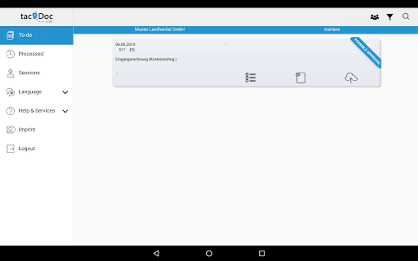 As part of tacoss.eMOBILE, tacDoc is an application for mobile access to selected data from tacoss.eTRADE via monitors, tablets and smartphones. With this mobile application you can retrieve, approve and upload documents at any time and any place.