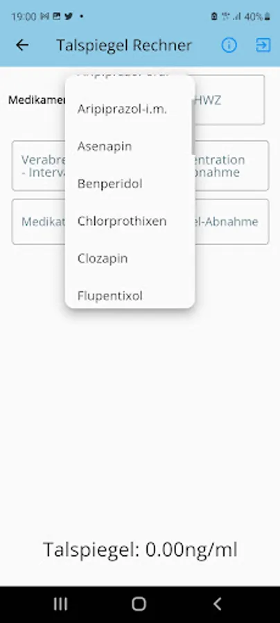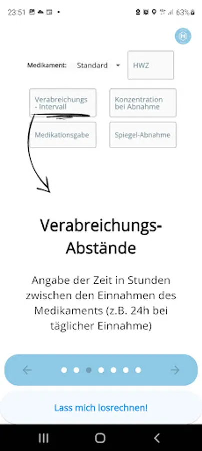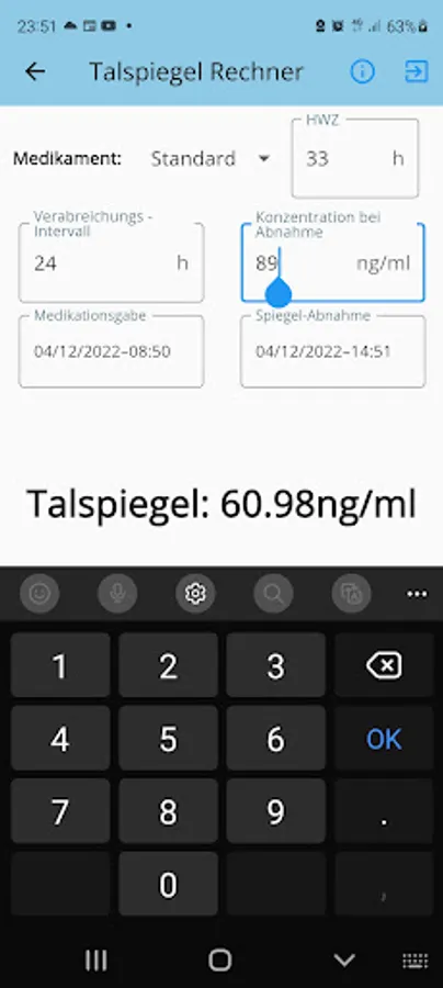 The trough level calculator helps you to calculate the trough level of medication with just a few pieces of information. This is particularly useful if you are unable to get blood concentrations of medications just prior to re-administration. Only certain psychotropic drugs are currently stored. Due to the selectable, freely fillable fields, however, it is possible to calculate the trough level for each drug.