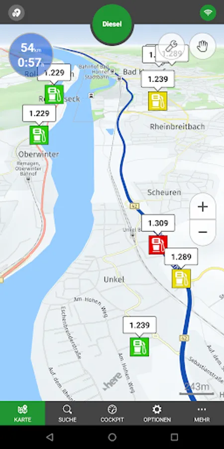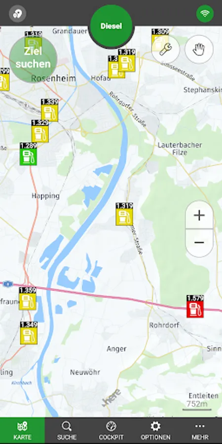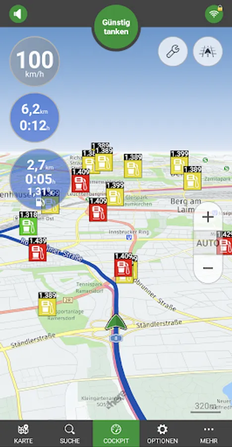 The tank pig app combines the latest fuel prices with a good map display, routing and navigation.