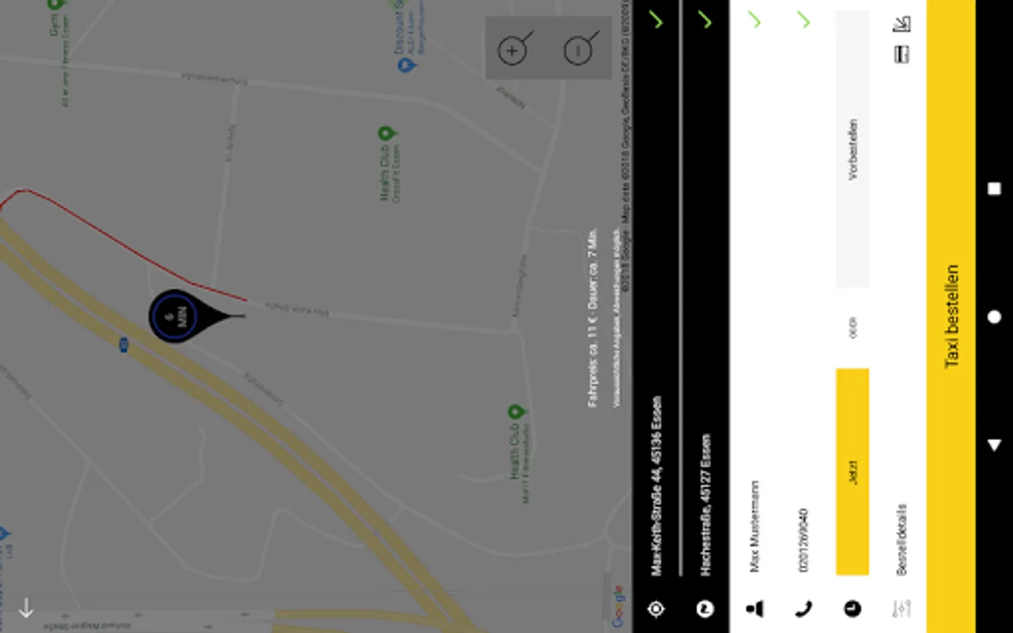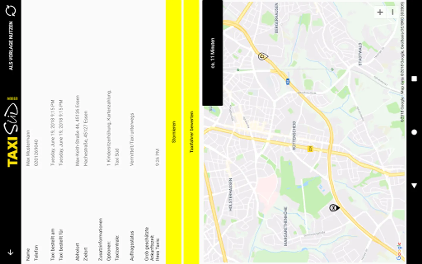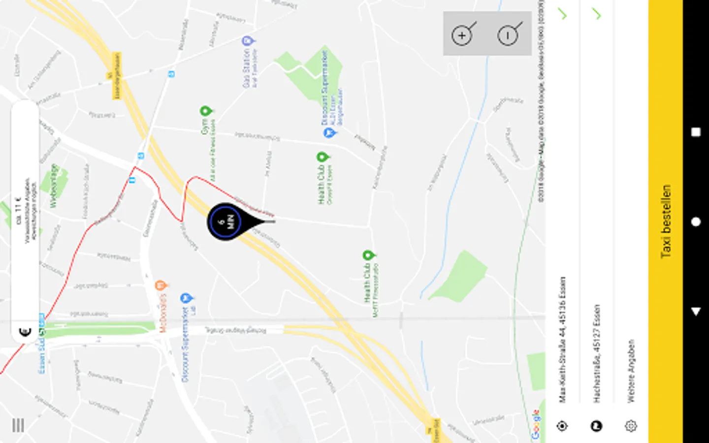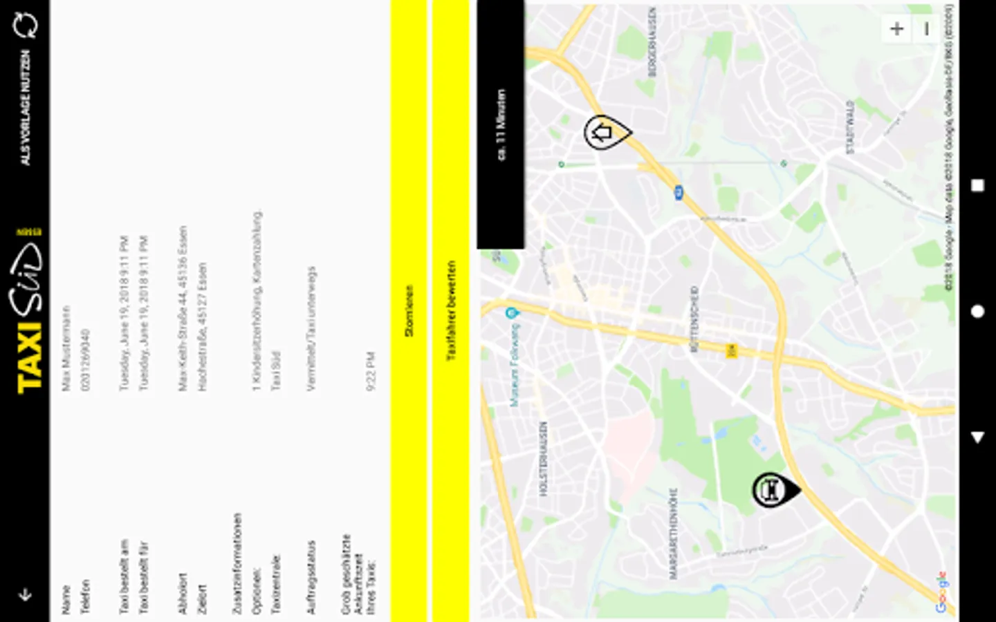 You will receive an order confirmation and can always view the exact status of your order (such as the duration of your Driving taxis). There are even your anticipated costs to the destination displayed (taxi fare to the city of Essen).