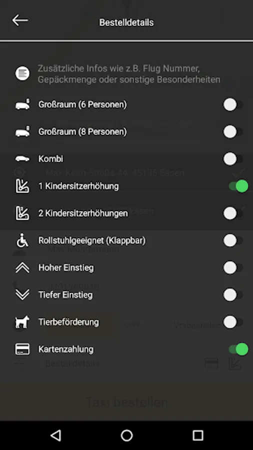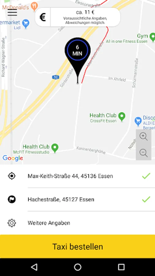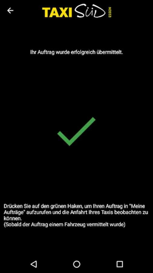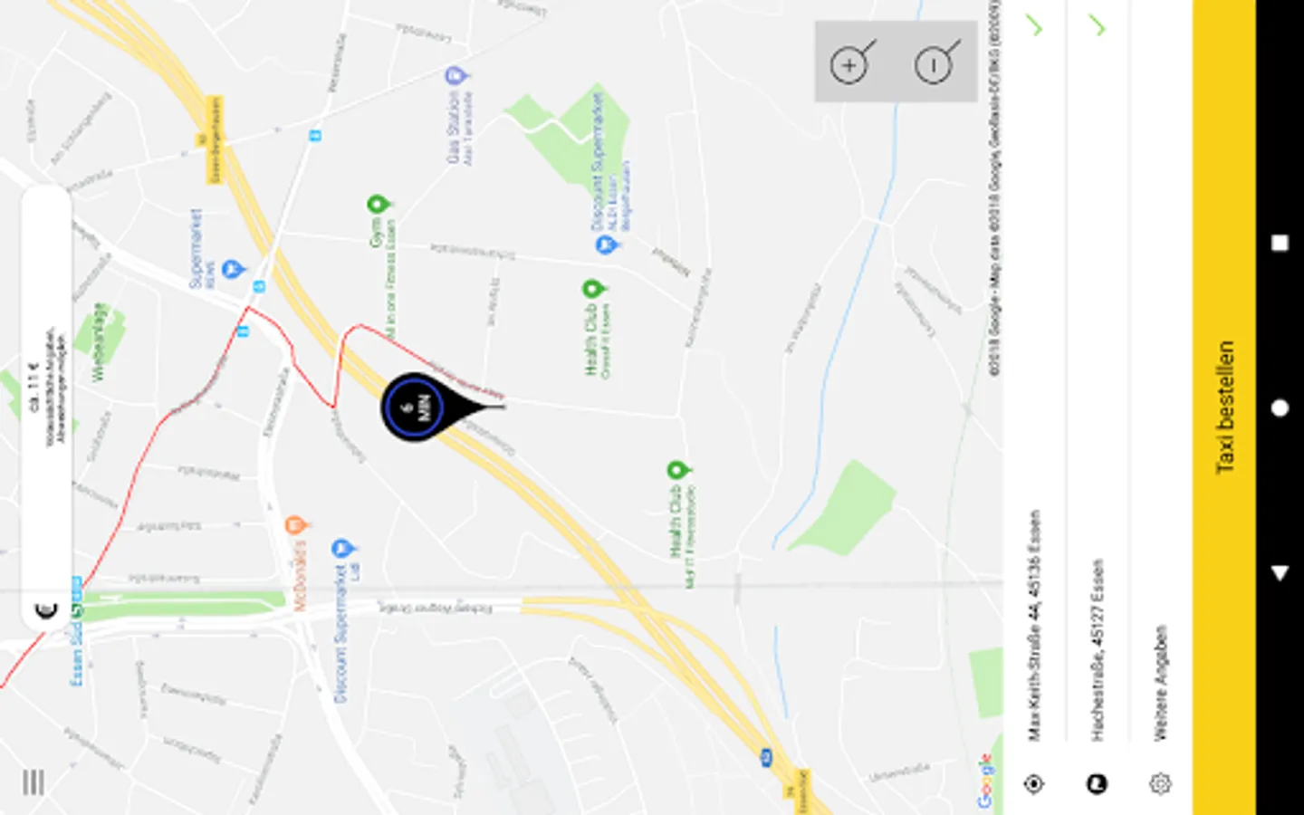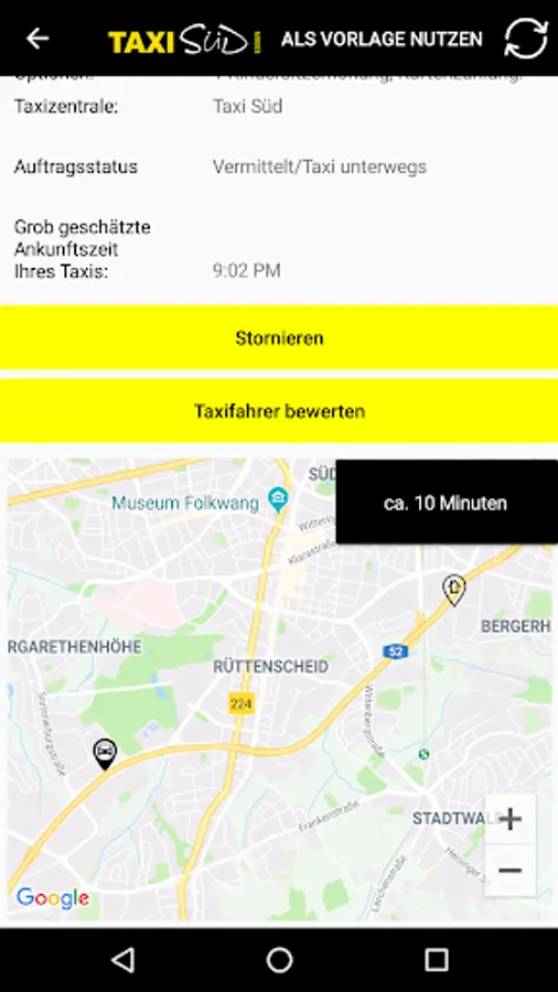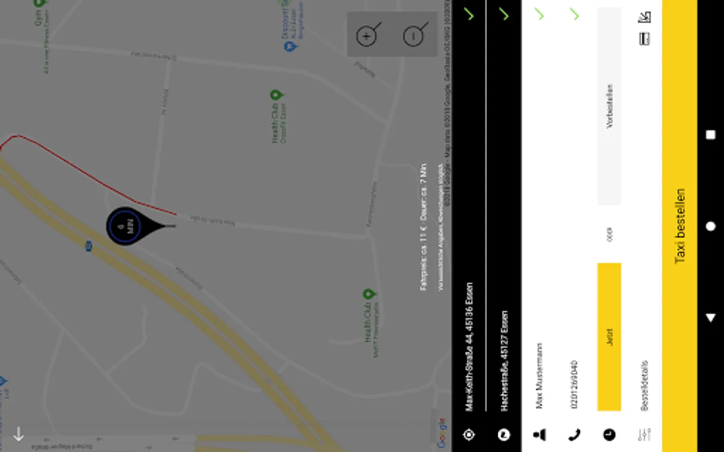 You will receive an order confirmation and can always view the exact status of your order (such as the duration of your Driving taxis). There are even your anticipated costs to the destination displayed (taxi fare to the city of Essen).