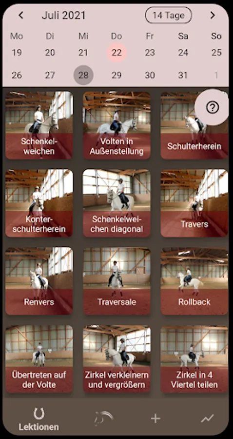 In addition to your training, RidingCoach serves to offer you incentives and ideas on how you can combine exercises in order to train your horse to keep it healthy. If you are unsure, ask your trainer or simply integrate the app's training into your riding lessons.