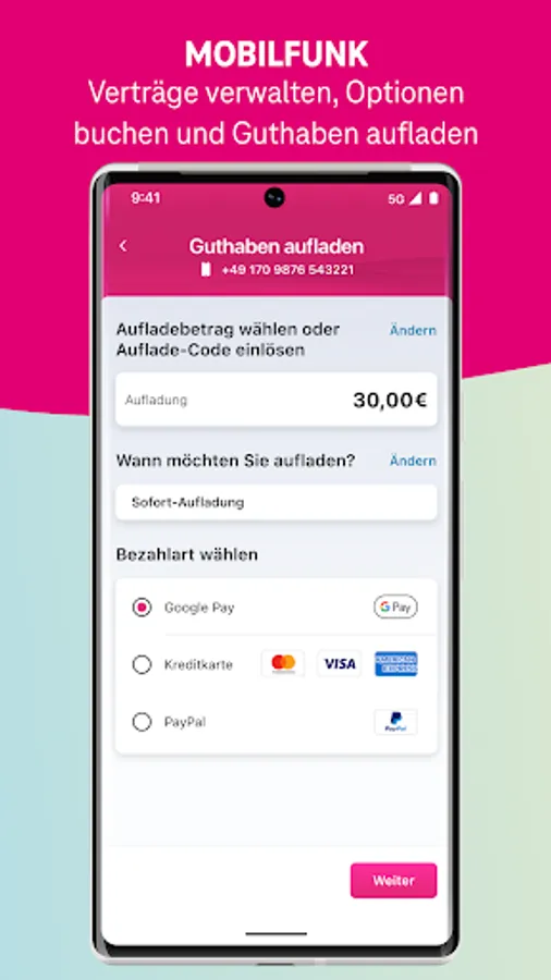 Use MeinMagenta to check your prepaid balance and remaining minutes and SMS allotments at any time. You have three convenient options for topping up: immediate top-up, the top-up code and automatic top-up.