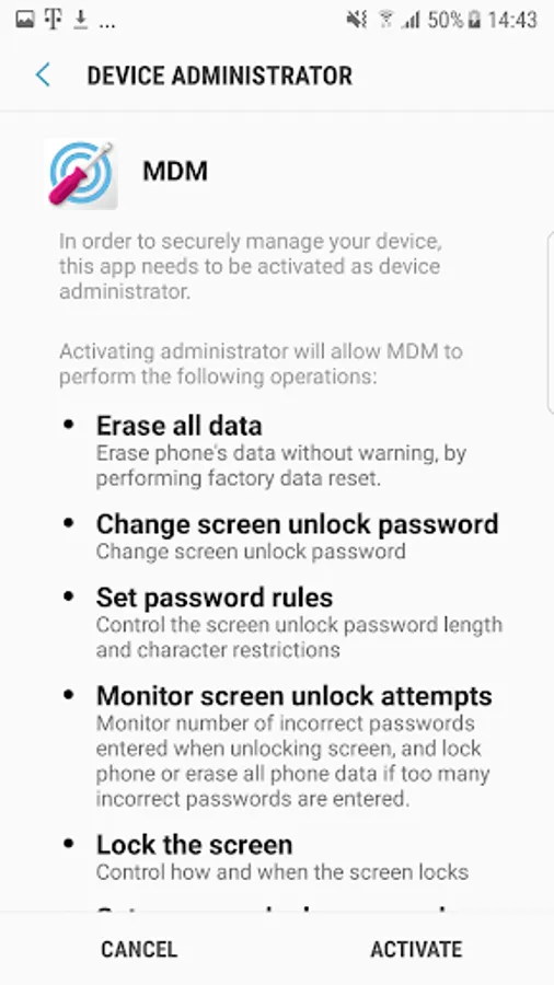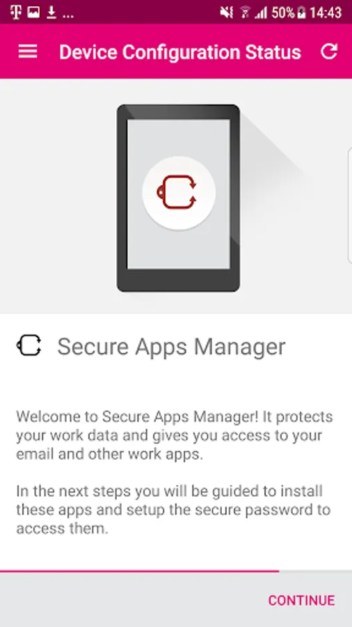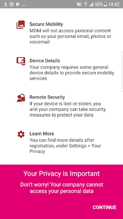 Note: MDM is used together with a Deutsche Telekom's SaaS service deployed by your company’s IT organization. Please follow the instructions from your IT organization to use this App. This MDM App is required on your device to access corporate resources and therefore should not be removed without first consulting your IT organization.
