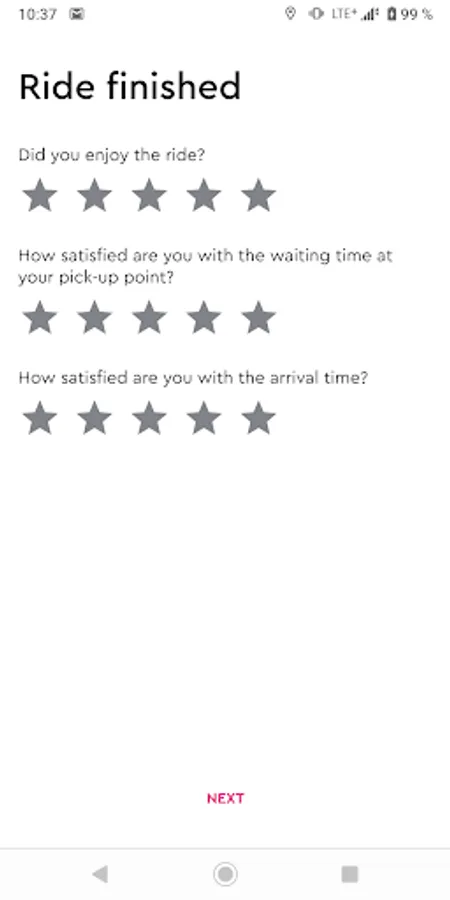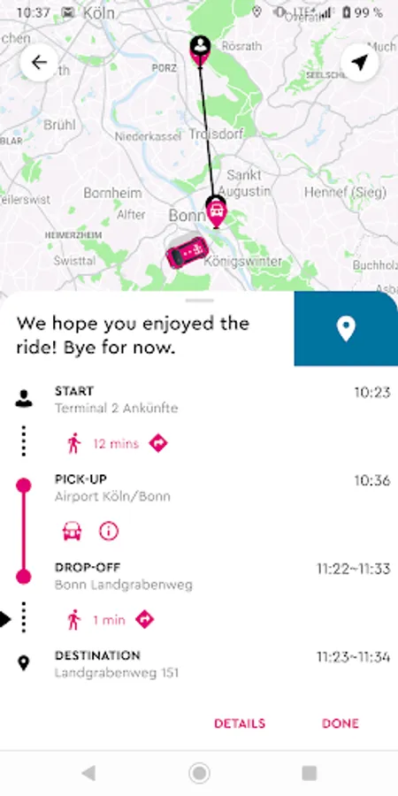 Close to your final destination we bring you to a virtuell shuttle stop. After that you can give us feedback by rating your ride. Finally we navigate you per app to your final destination.