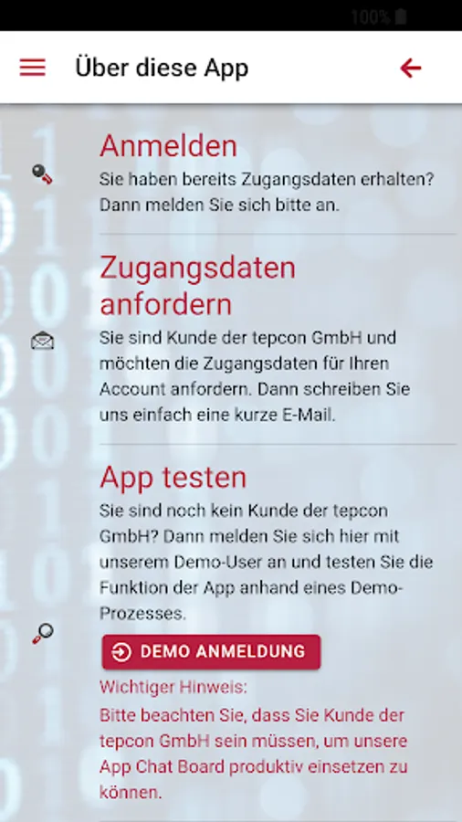 Important note: As the process steps and options must be coordinated and individualized at the respective time, the app can only be used sensibly for customers of tepcon GmbH and their users or their customers. To use some features, you may also need to give the app access to your camera, NFC feature or GPS location.
