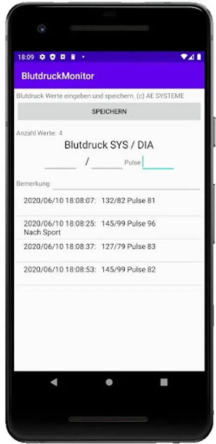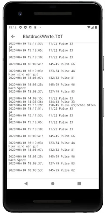 Enter blood pressure values and save them in a separate TXT file in the download directory. If desired, they can then be transferred to a PC and imported and evaluated there as XLS CSV data, e.g. in Excel, Word or similar.
