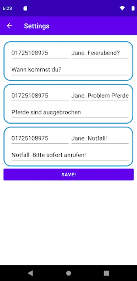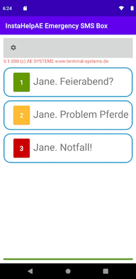 The APP allows the fixed setting of SMS texts, recipients and displays them in a color-coded traffic light: