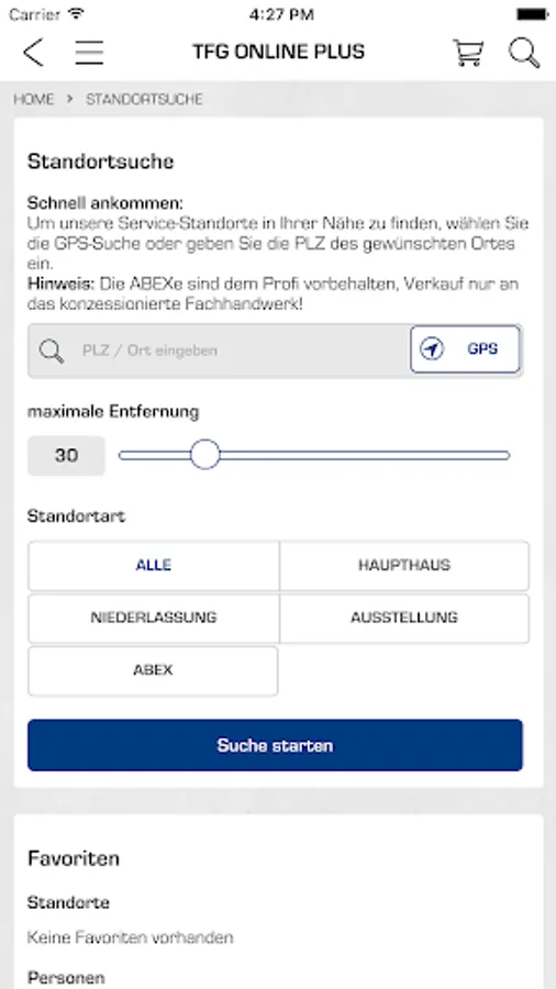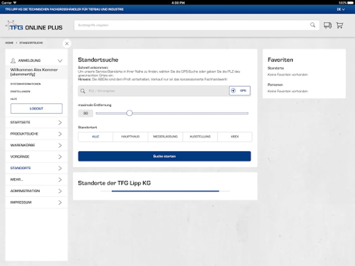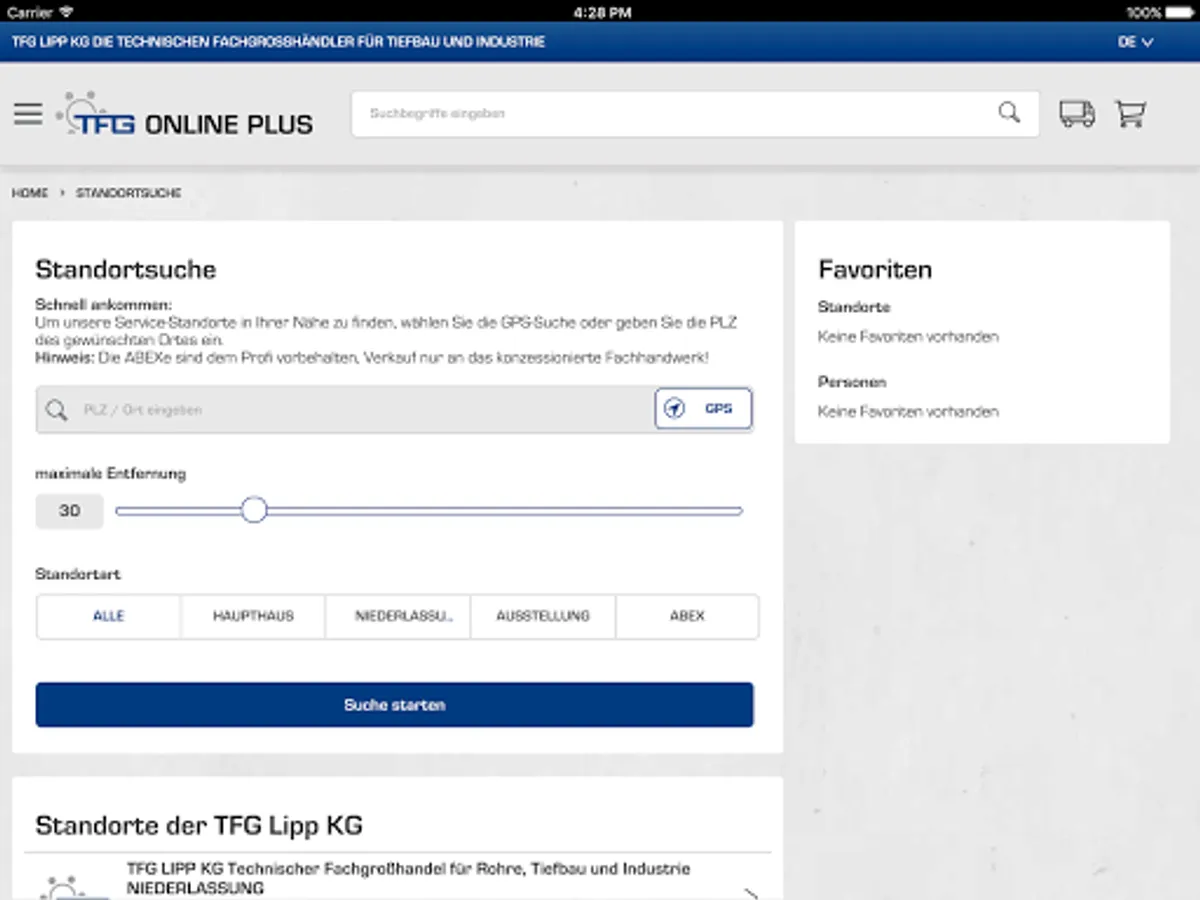 Service on the go: Where is the nearest TFG location? Via GPS or by entering the zip code finds this app feature all the surrounding branches of the nationwide wholesaler network.