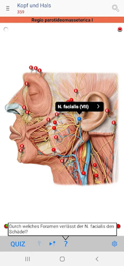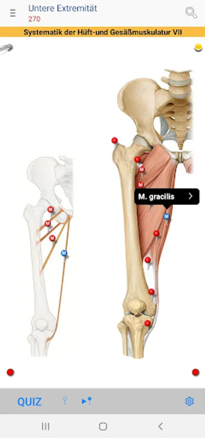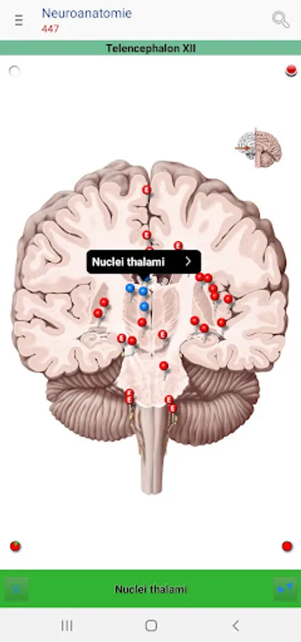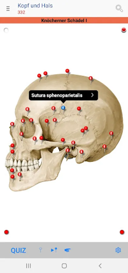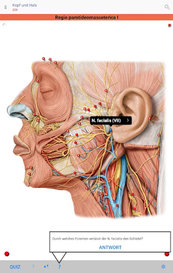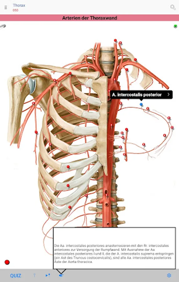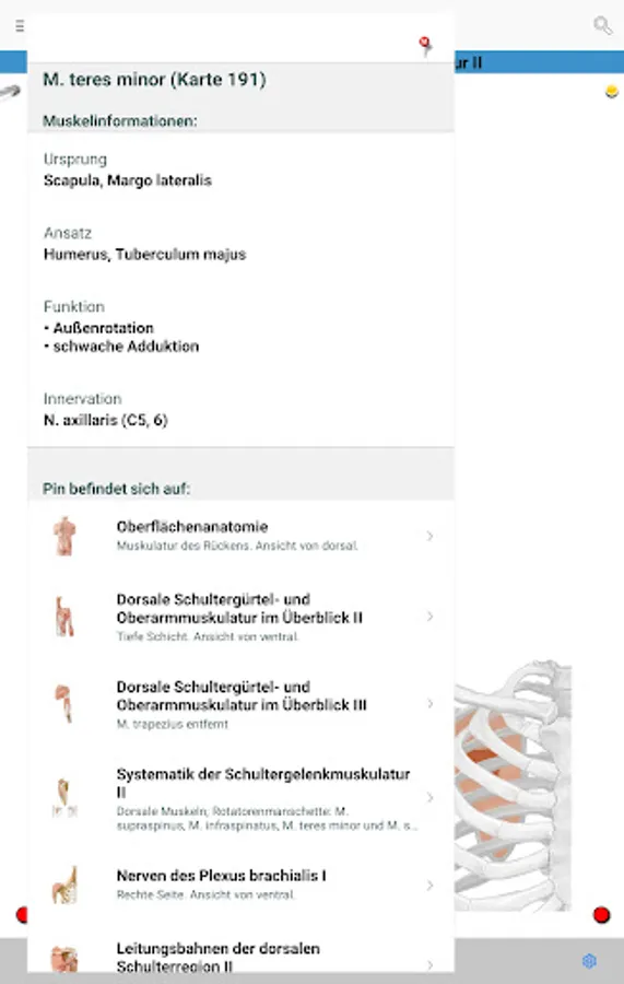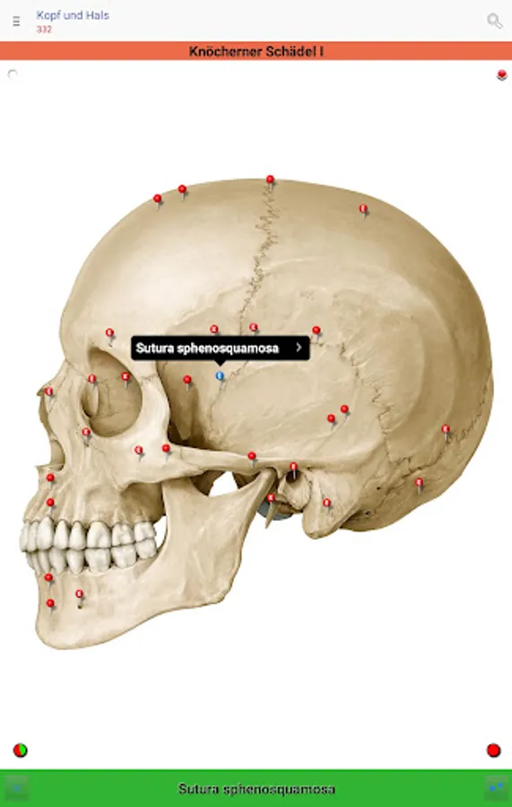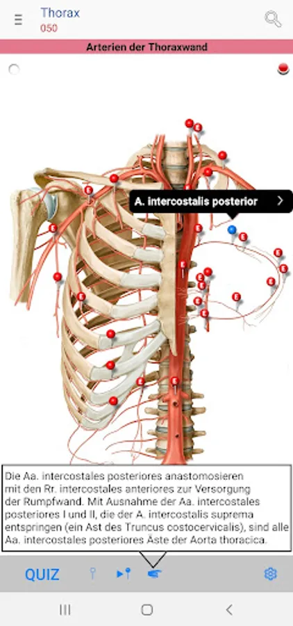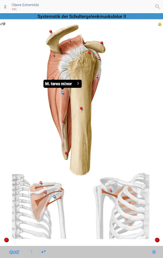 • Red pins: mark and name the anatomical structures that are assessed as basic knowledge, analogous to the printed edition of the PROMETHEUS Anatomy Learning Cards