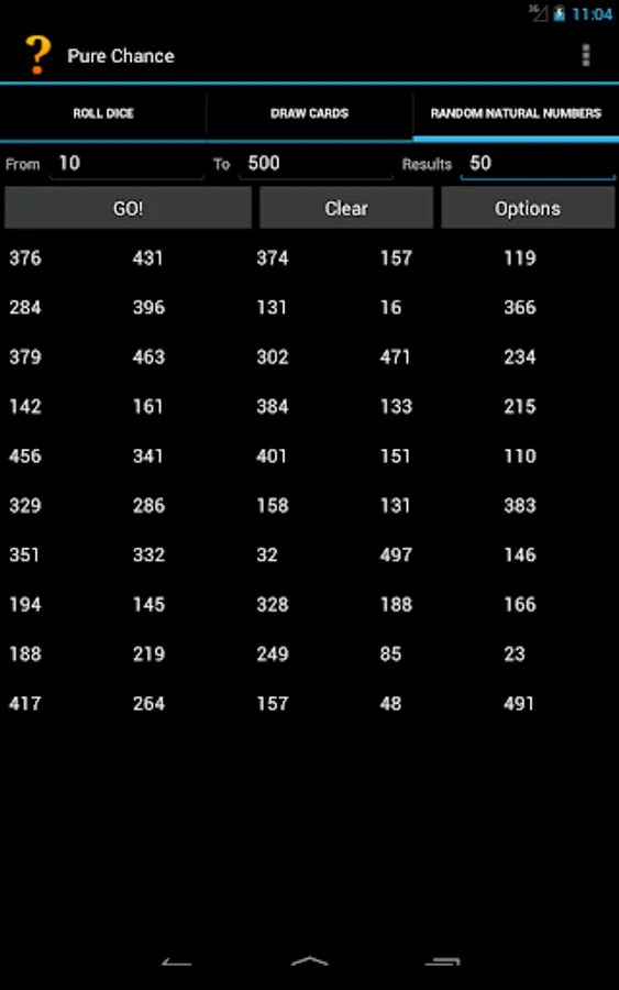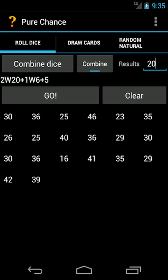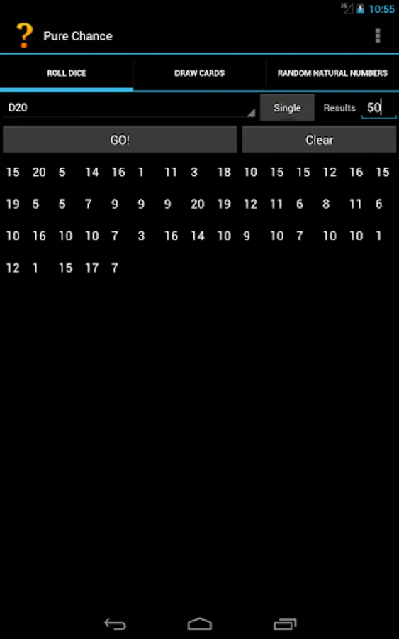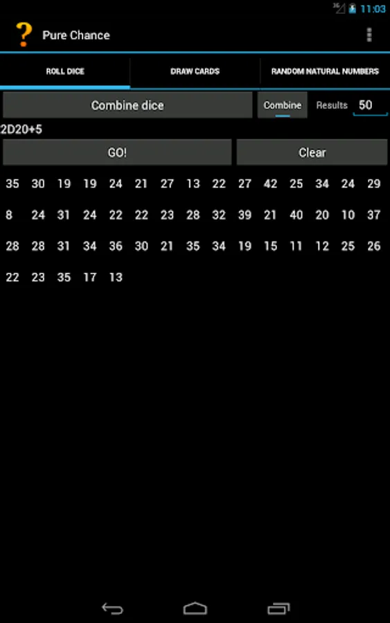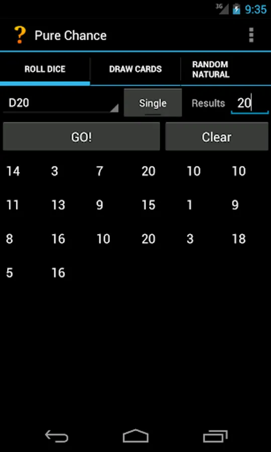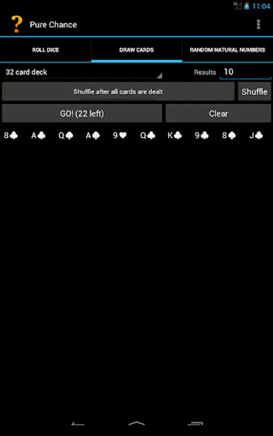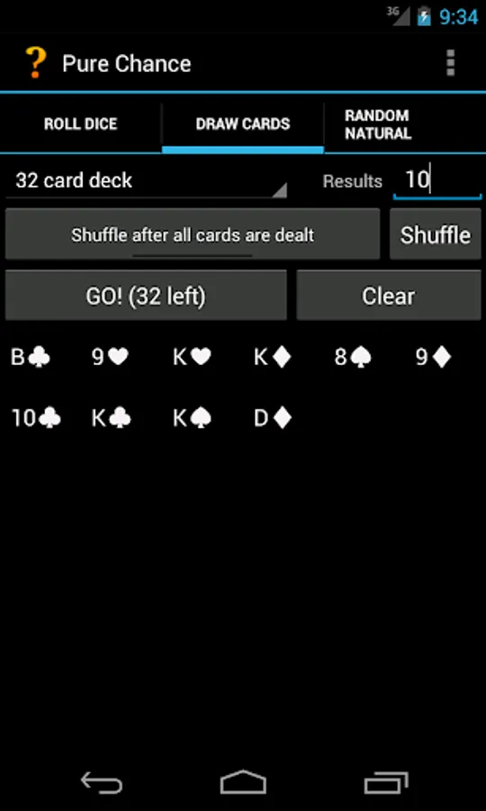 Provides cards (32- and 52-deck), dice (4-, 6-, 8-, 10-, 12- and 20-sided; single and combinations) and numbers