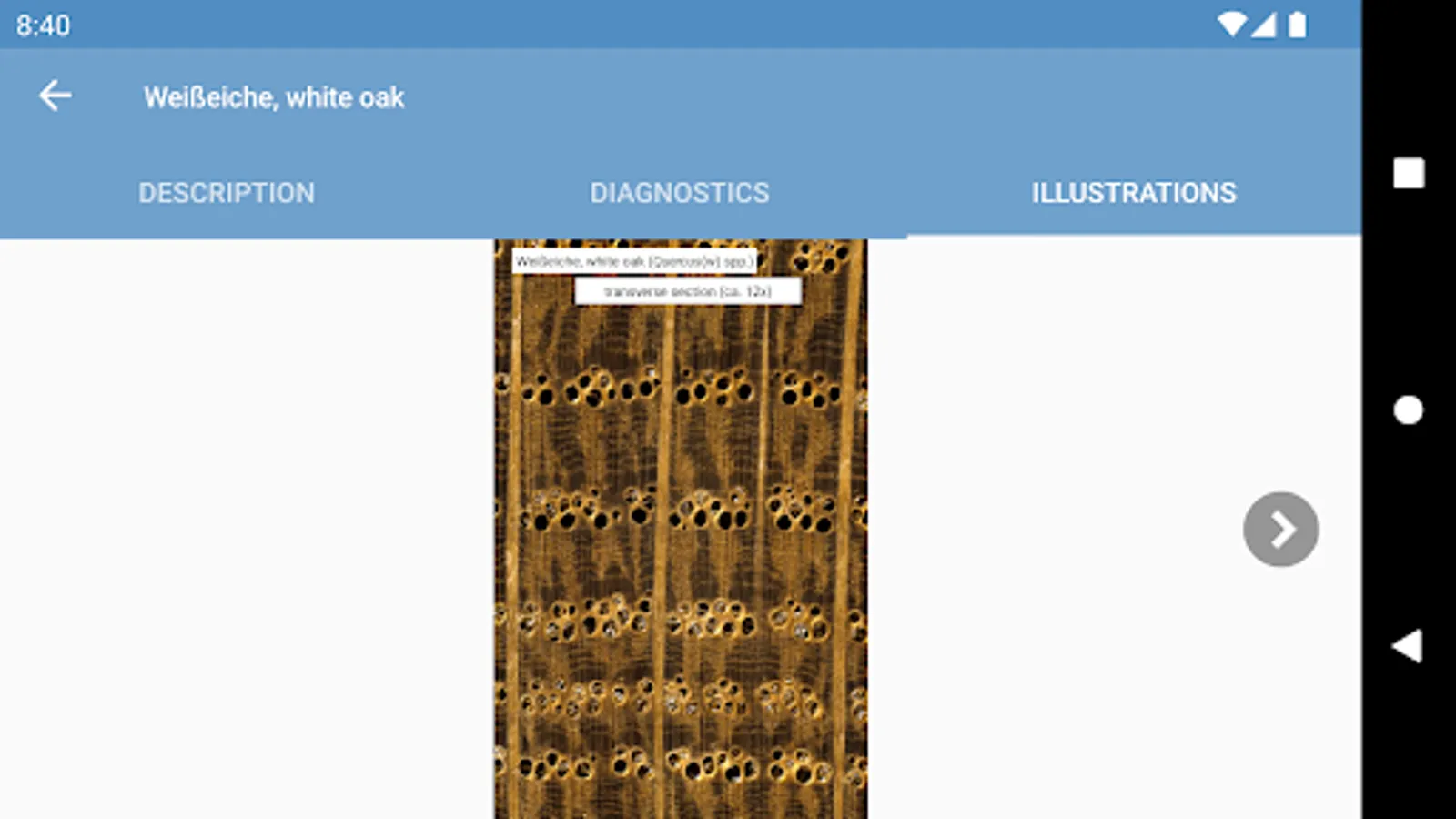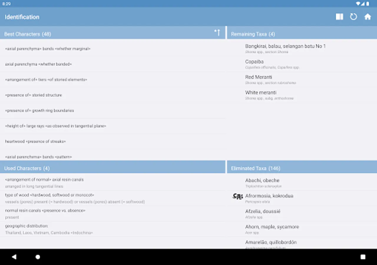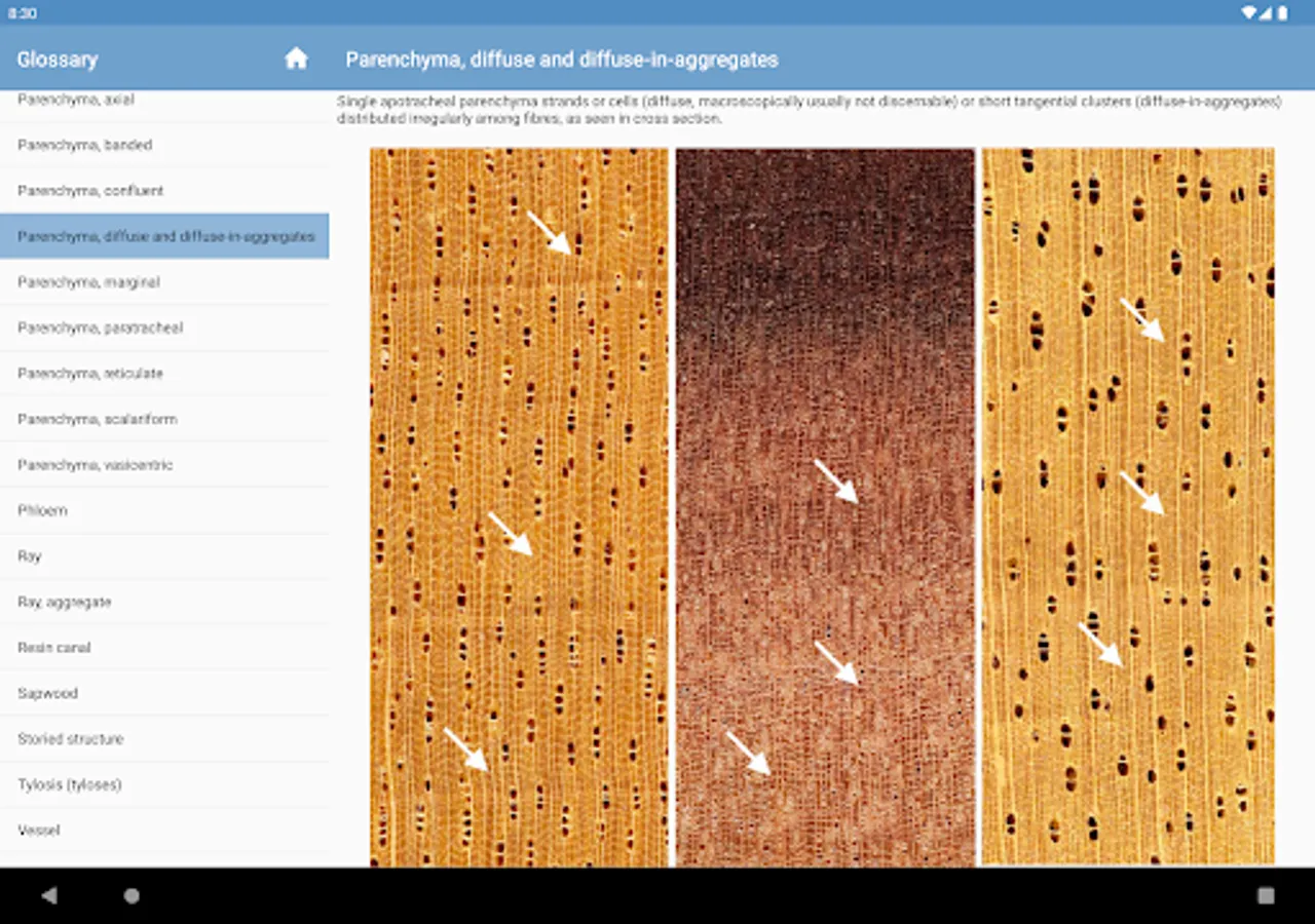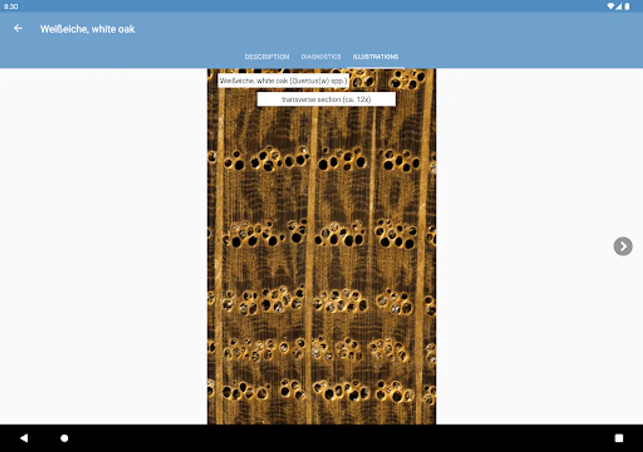 • interactive identification of common trade timbers (hardwoods and softwoods) based on macroscopic features to be observed with the unaided eye or with a hand lens,