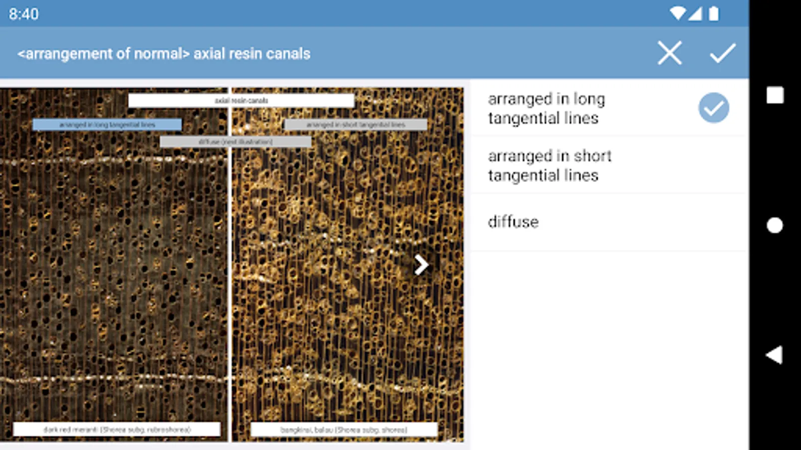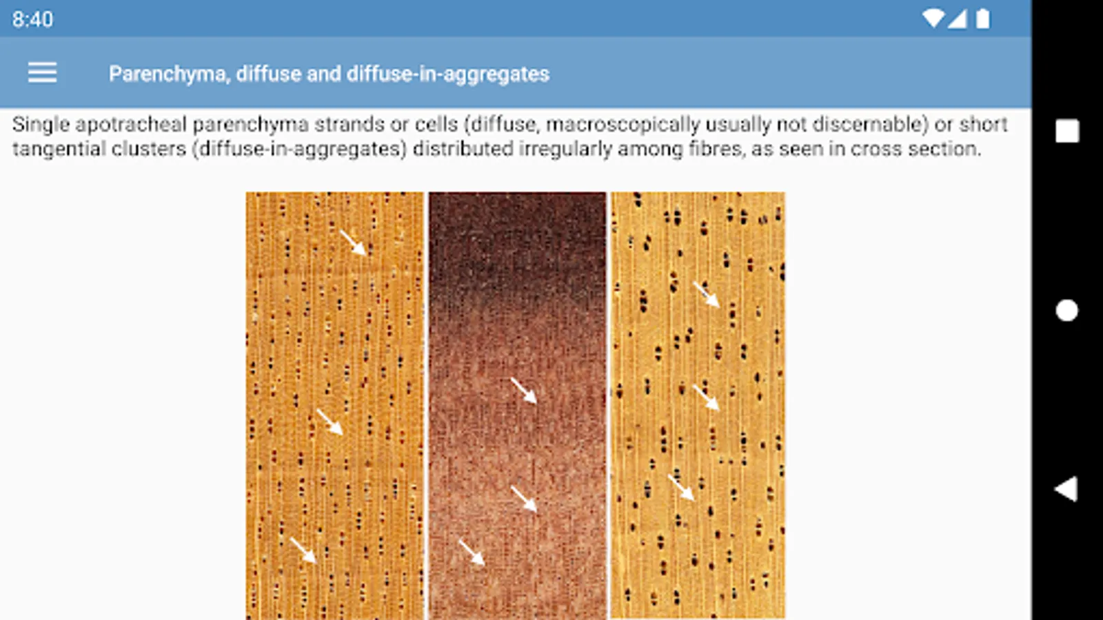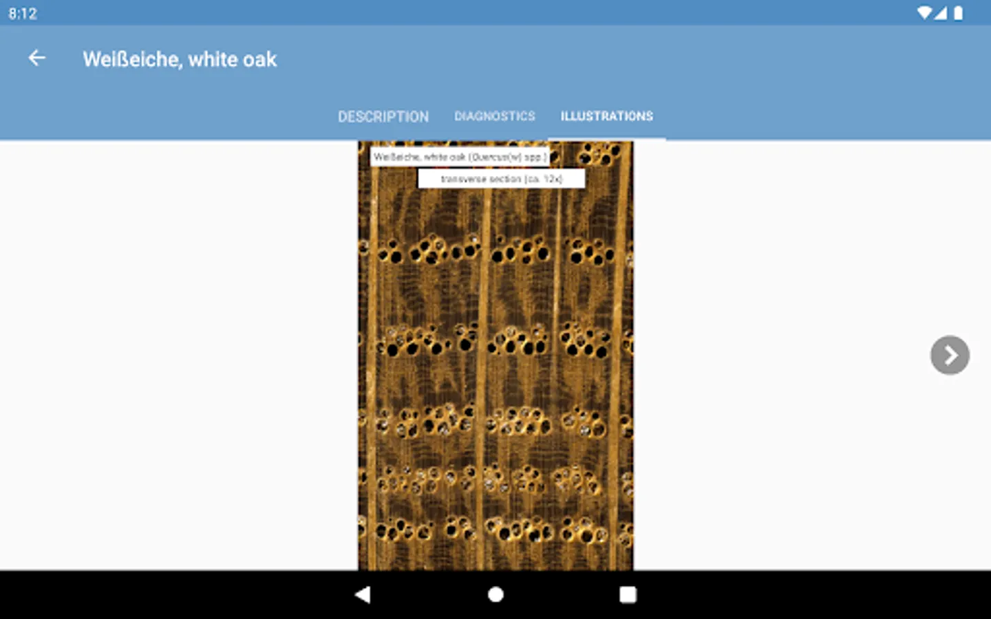 • interactive identification of common trade timbers (hardwoods and softwoods) based on macroscopic features to be observed with the unaided eye or with a hand lens,
