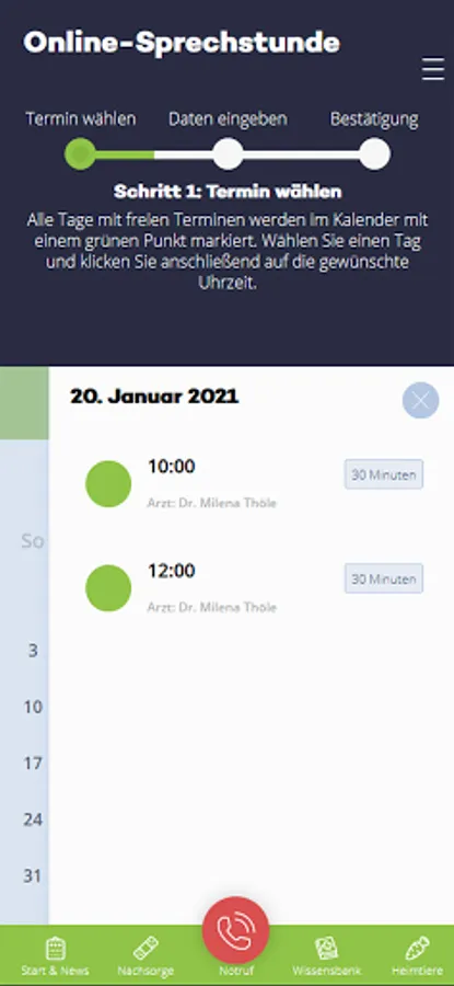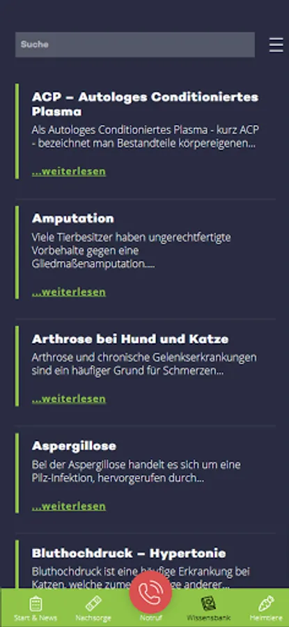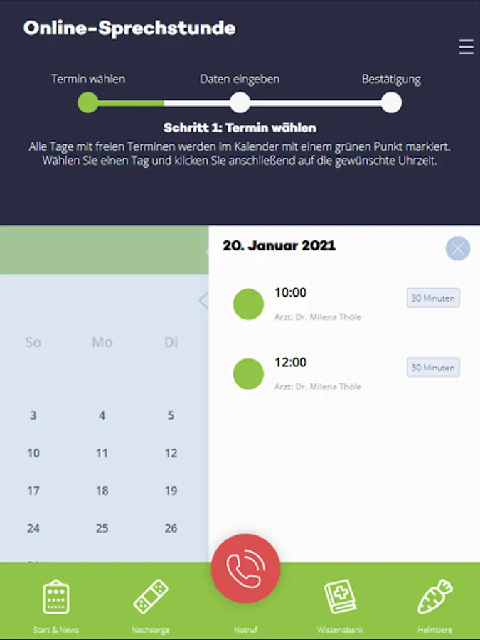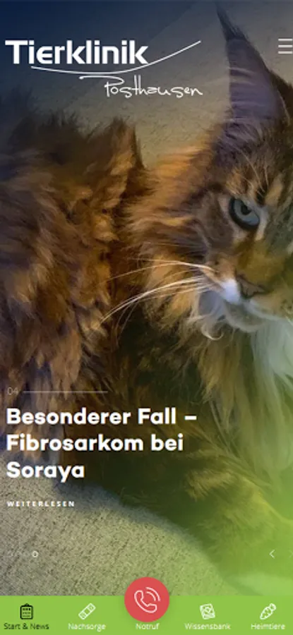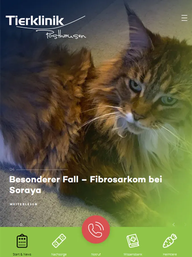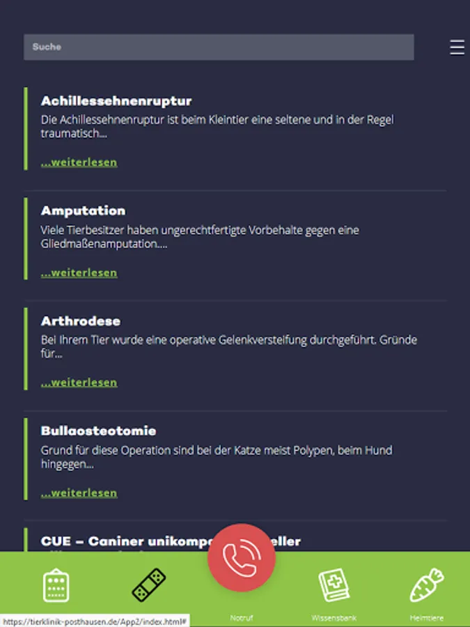 The app gives pet owners quick help in an emergency via the emergency call button and the knowledge base. The veterinary clinic app also offers information on pre-care and aftercare for pets, dogs and cats. Telephone information appointments can be made using the office hours form. Other features: